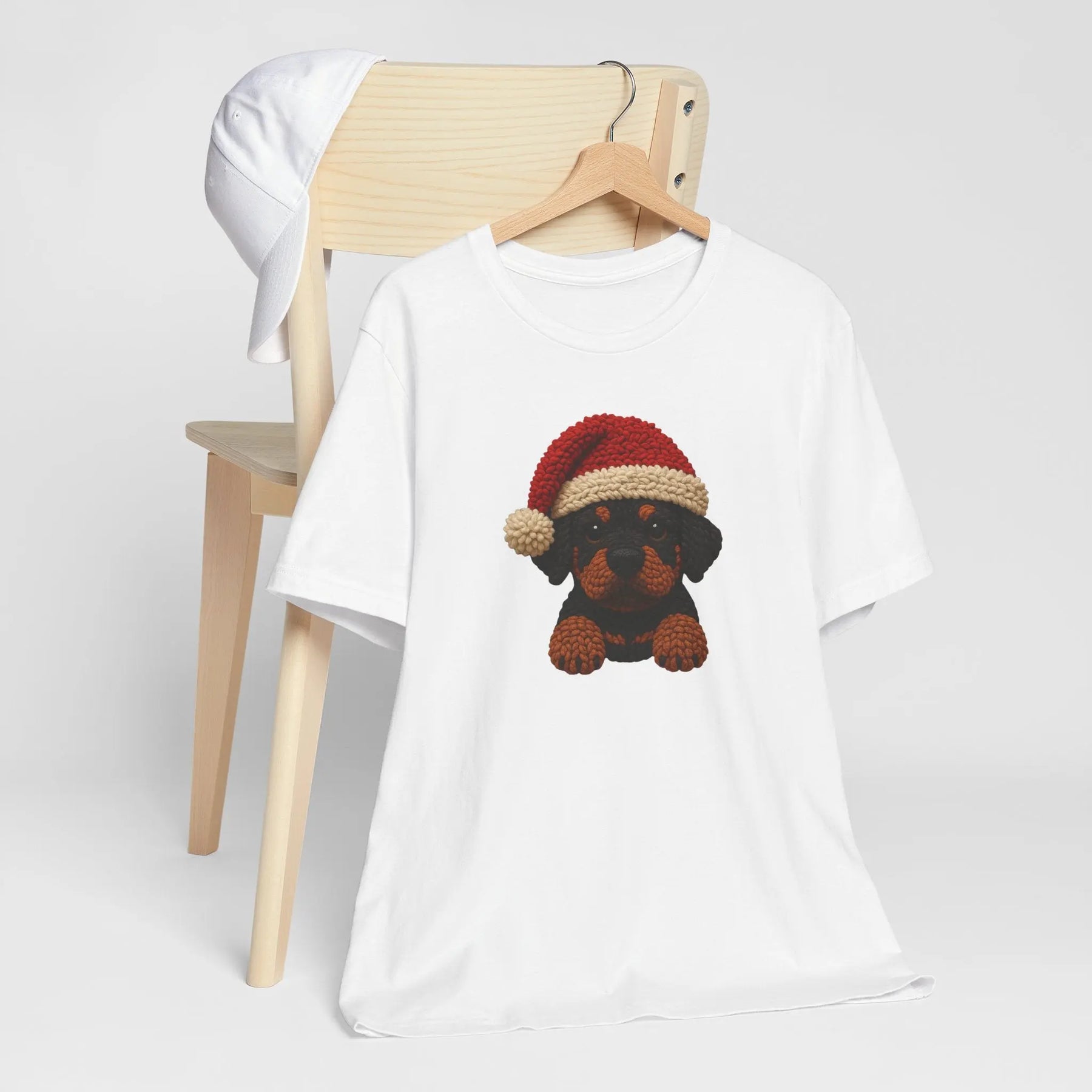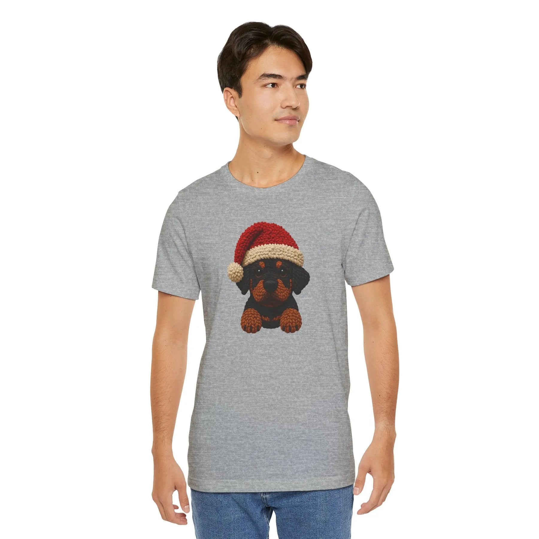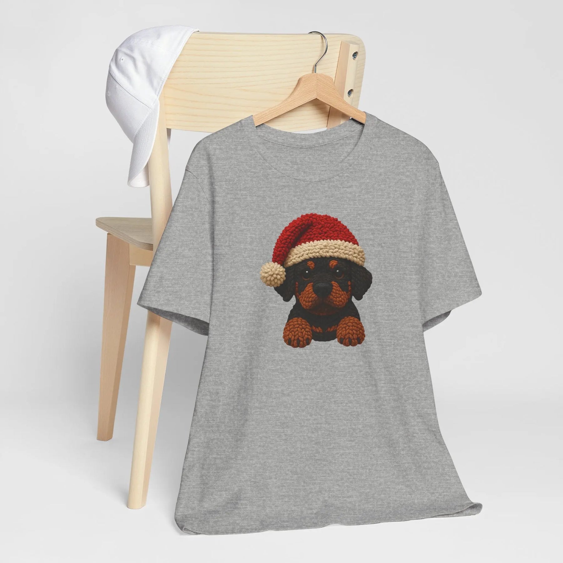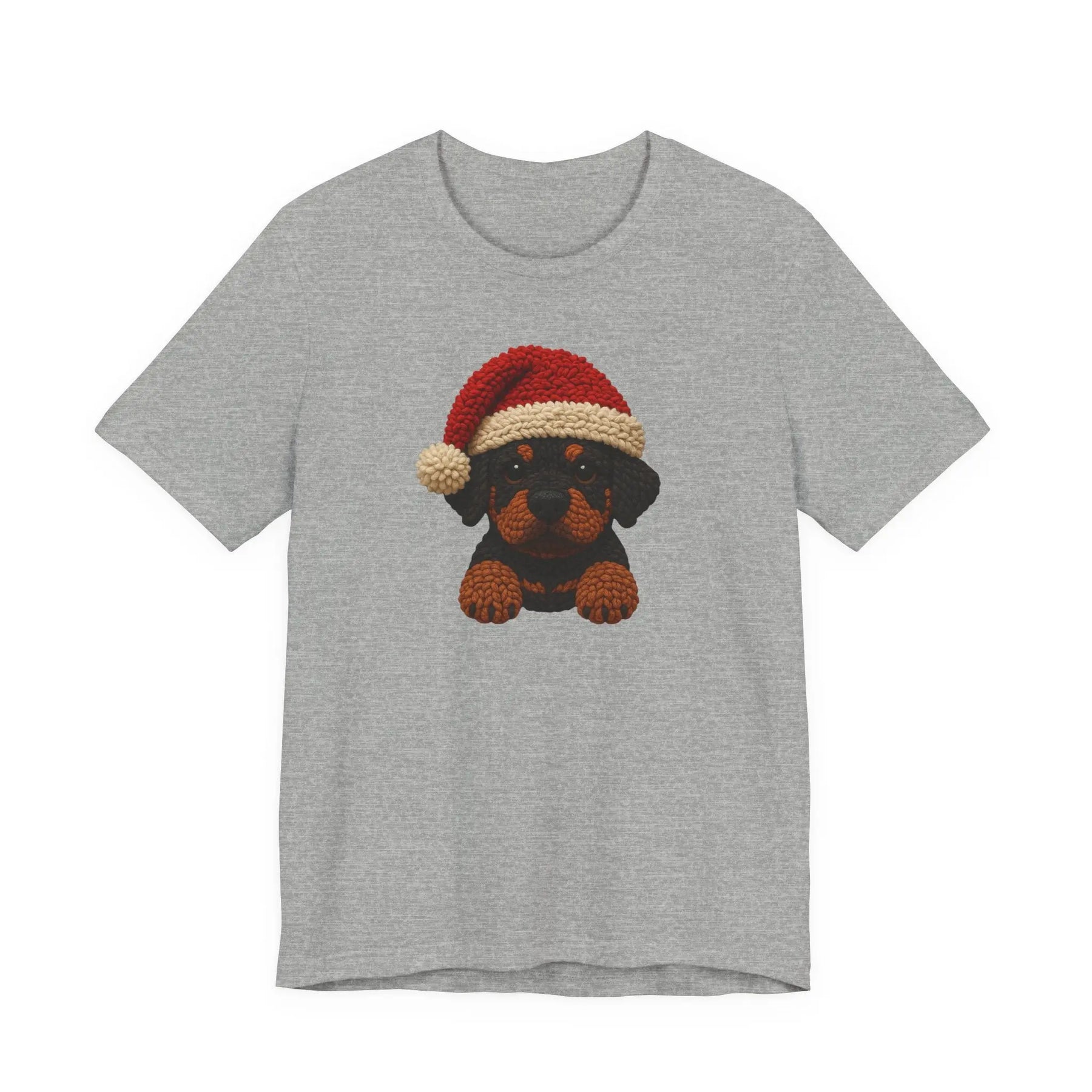 Ce tee-shirt en jersey léger apporte une touche festive douce et discrète grâce à un petit rottweiler façon crochet, coiffé d’un bonnet de Noël tricoté. Le motif, chaleureux et texturé, évoque un objet fait main, comme une décoration que l’on sortirait chaque année avec tendresse. Placé au centre, il ajoute une note joyeuse sans être tape-à-l’œil.