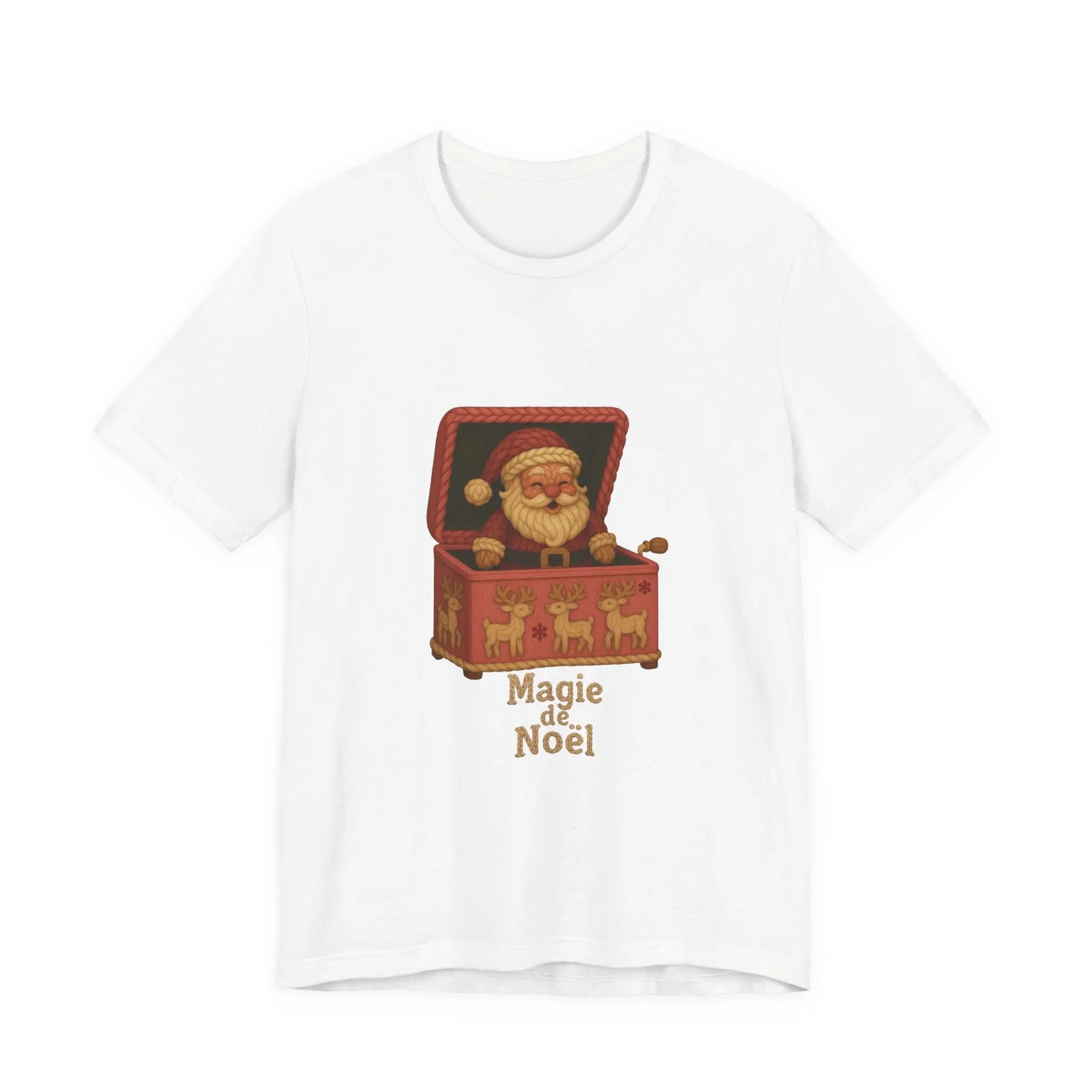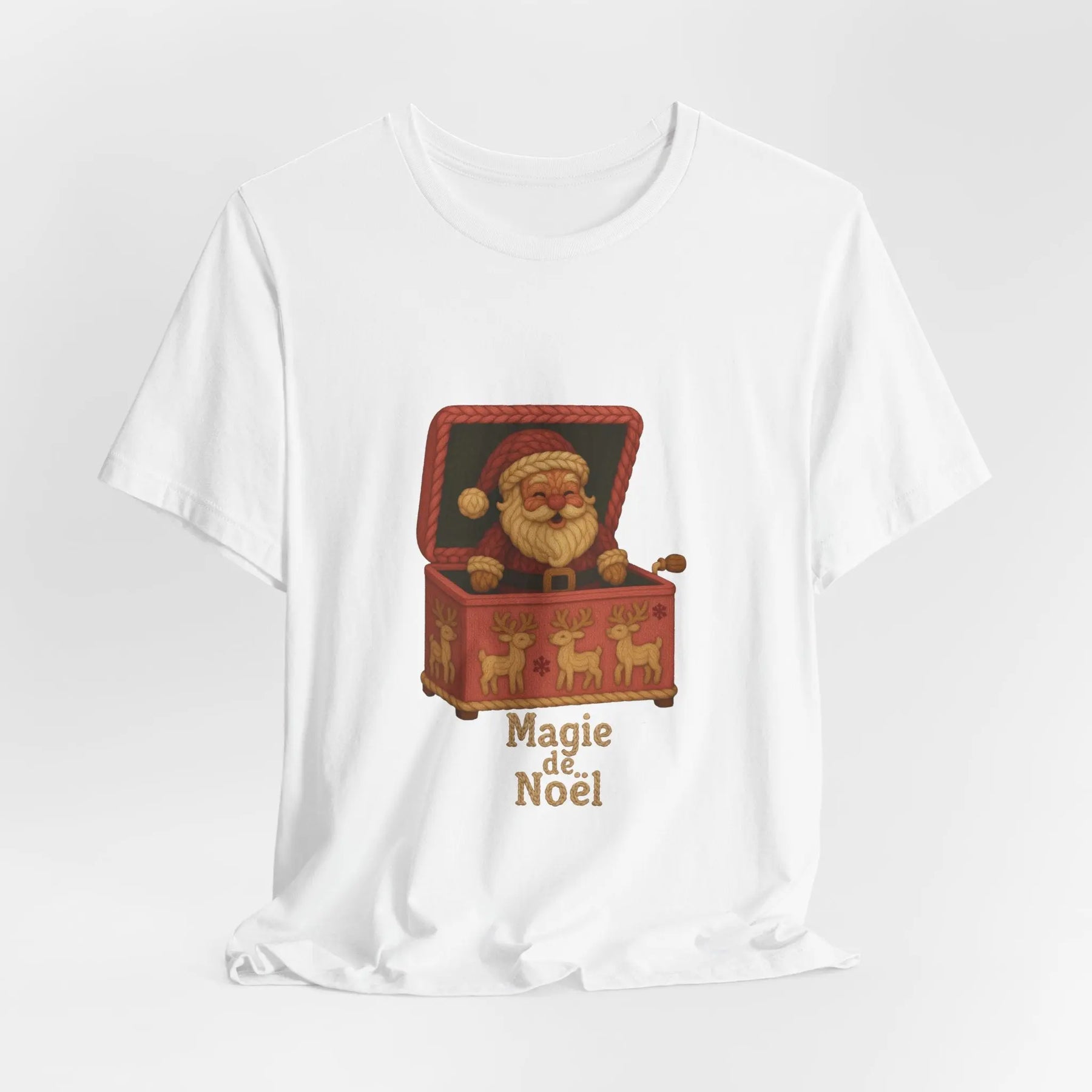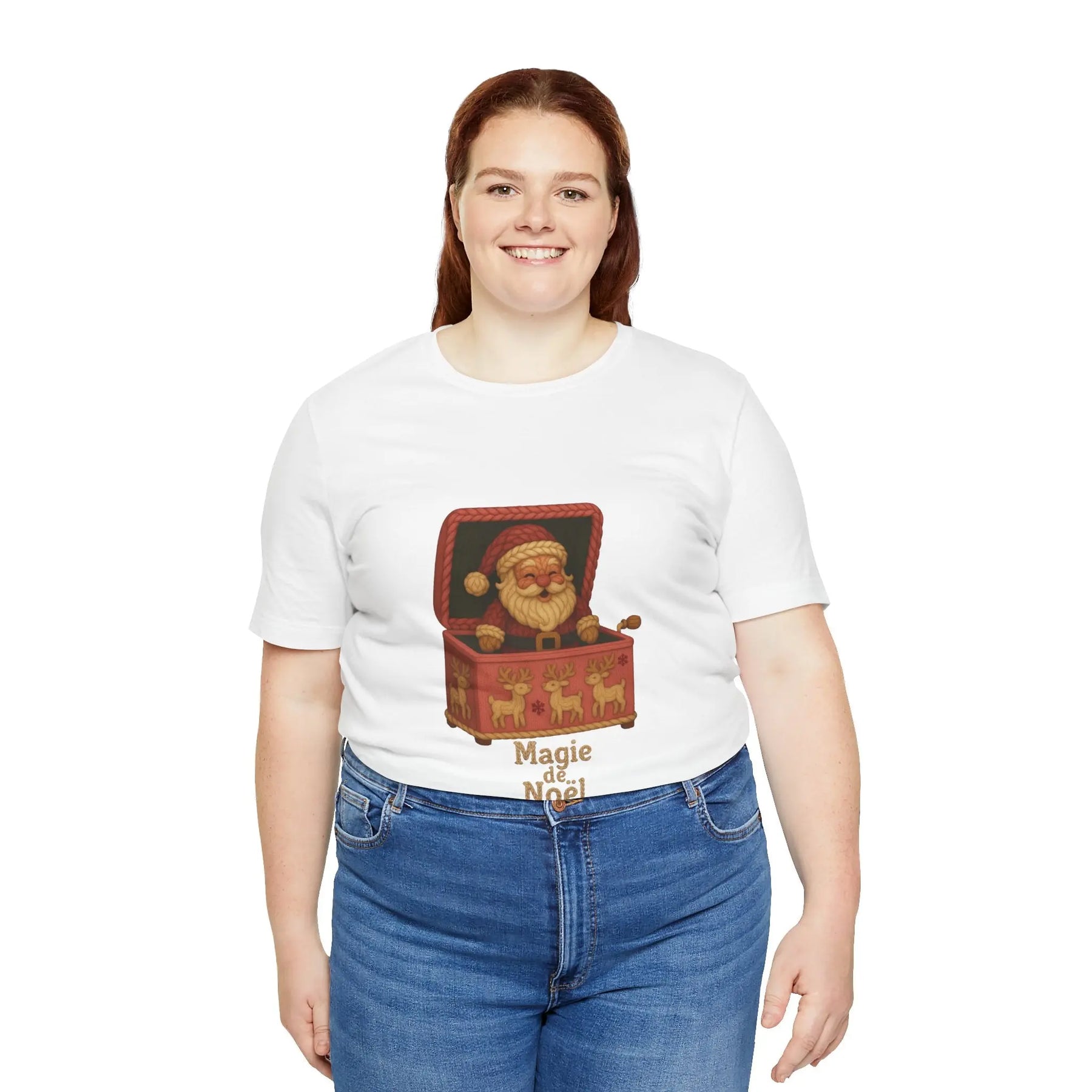 Un t-shirt doux, léger et rempli de nostalgie, pensé pour celles et ceux qui aiment la magie de Noël tout en subtilité. Sur le devant, une illustration chaleureuse façon gros crochet : un Père Noël joyeux, lové dans une petite boîte à musique rose ornée de rennes, accompagné de la mention « Magie de Noël ». L’ensemble rappelle les Noëls d’enfance, les décorations faites main, les mélodies qui tournent doucement pendant que la maison s’illumine.