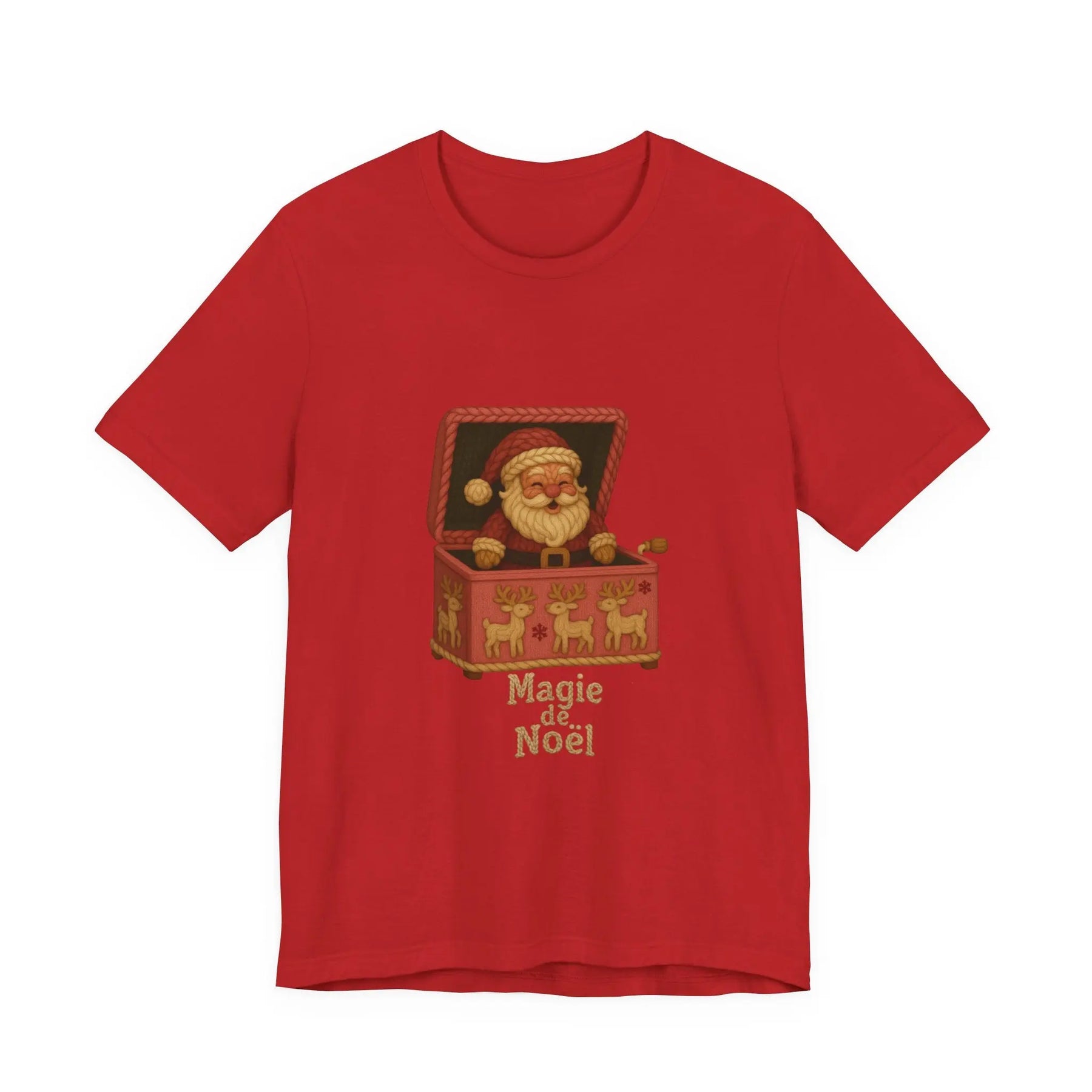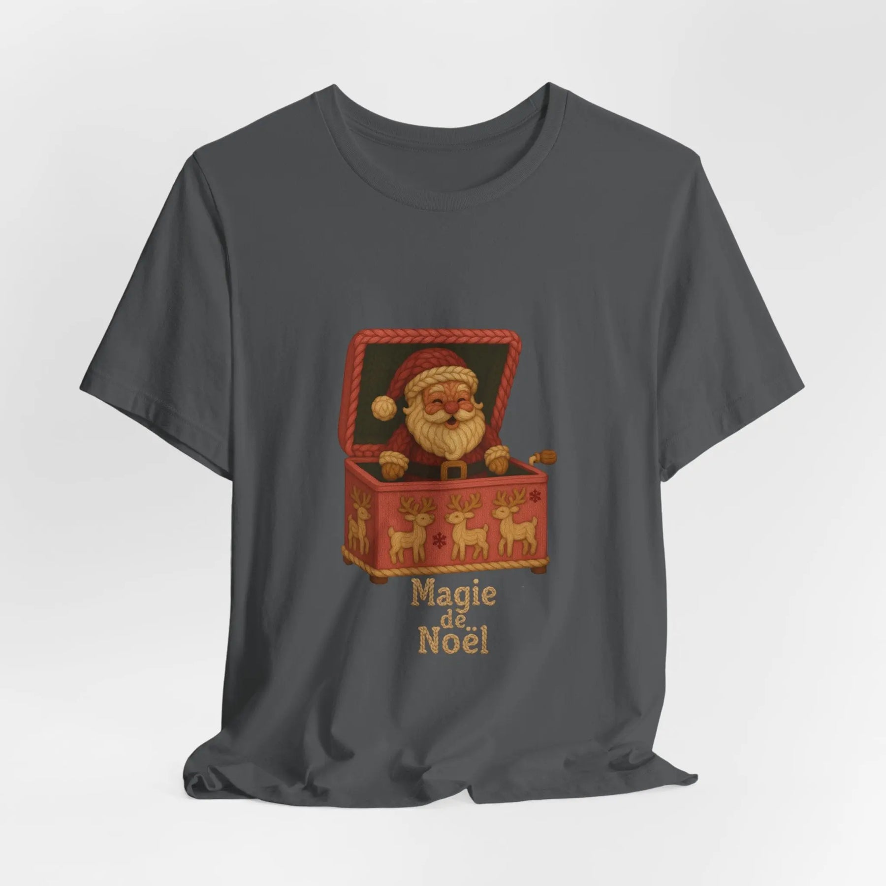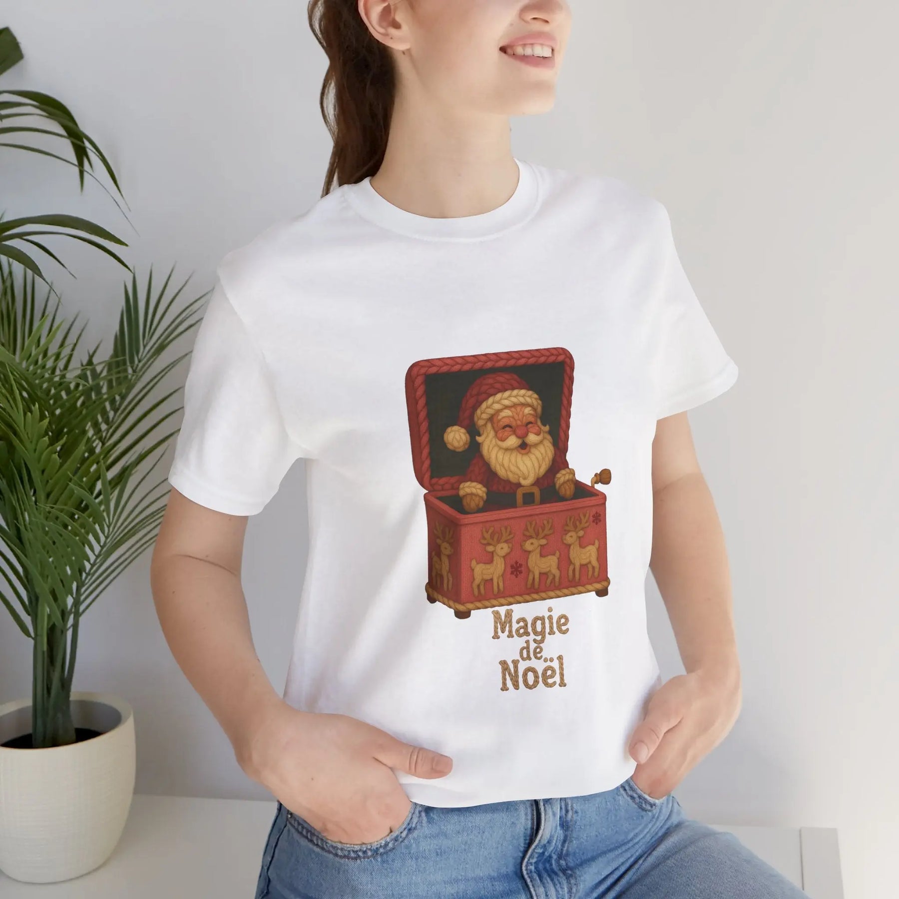 Un t-shirt doux, léger et rempli de nostalgie, pensé pour celles et ceux qui aiment la magie de Noël tout en subtilité. Sur le devant, une illustration chaleureuse façon gros crochet : un Père Noël joyeux, lové dans une petite boîte à musique rose ornée de rennes, accompagné de la mention « Magie de Noël ». L’ensemble rappelle les Noëls d’enfance, les décorations faites main, les mélodies qui tournent doucement pendant que la maison s’illumine.