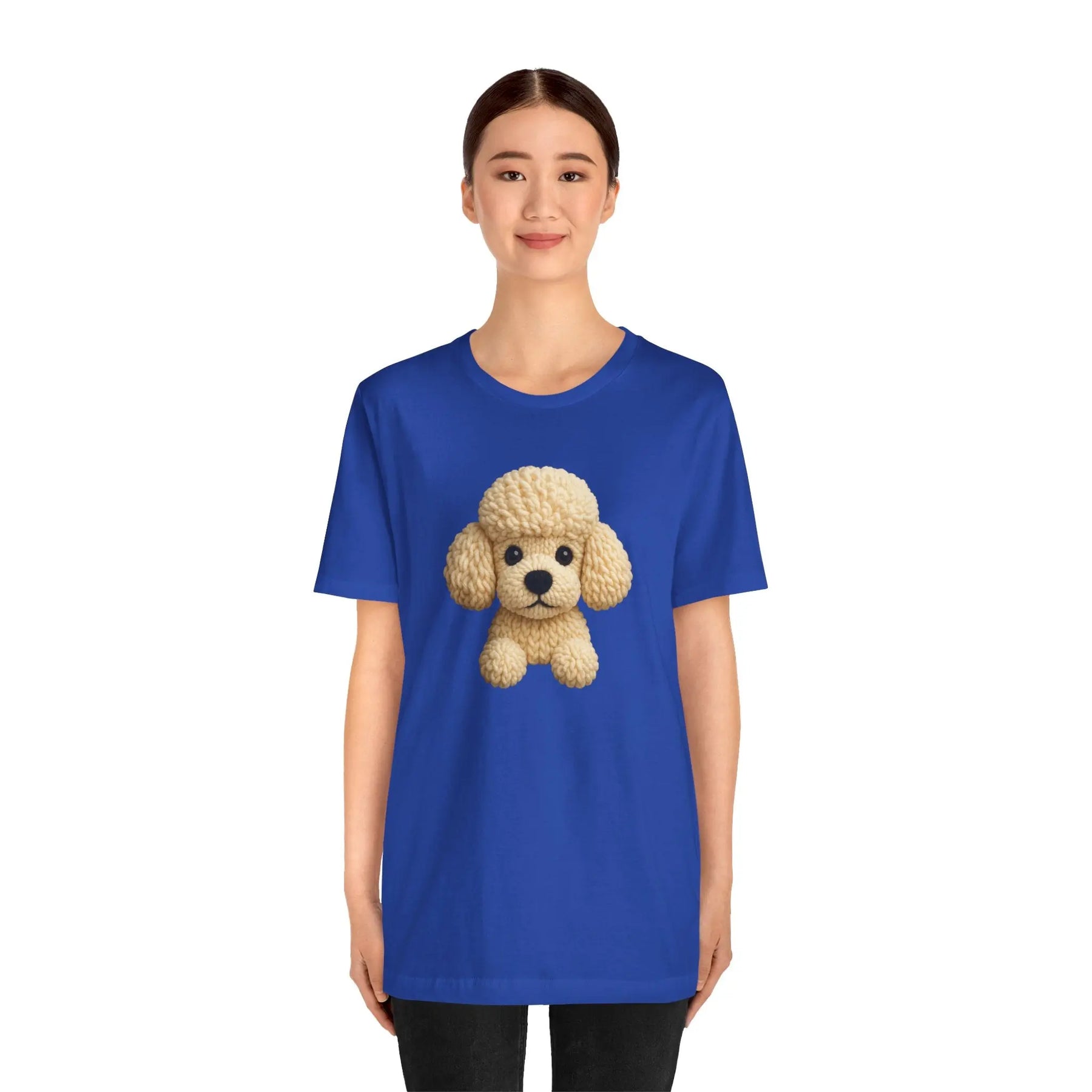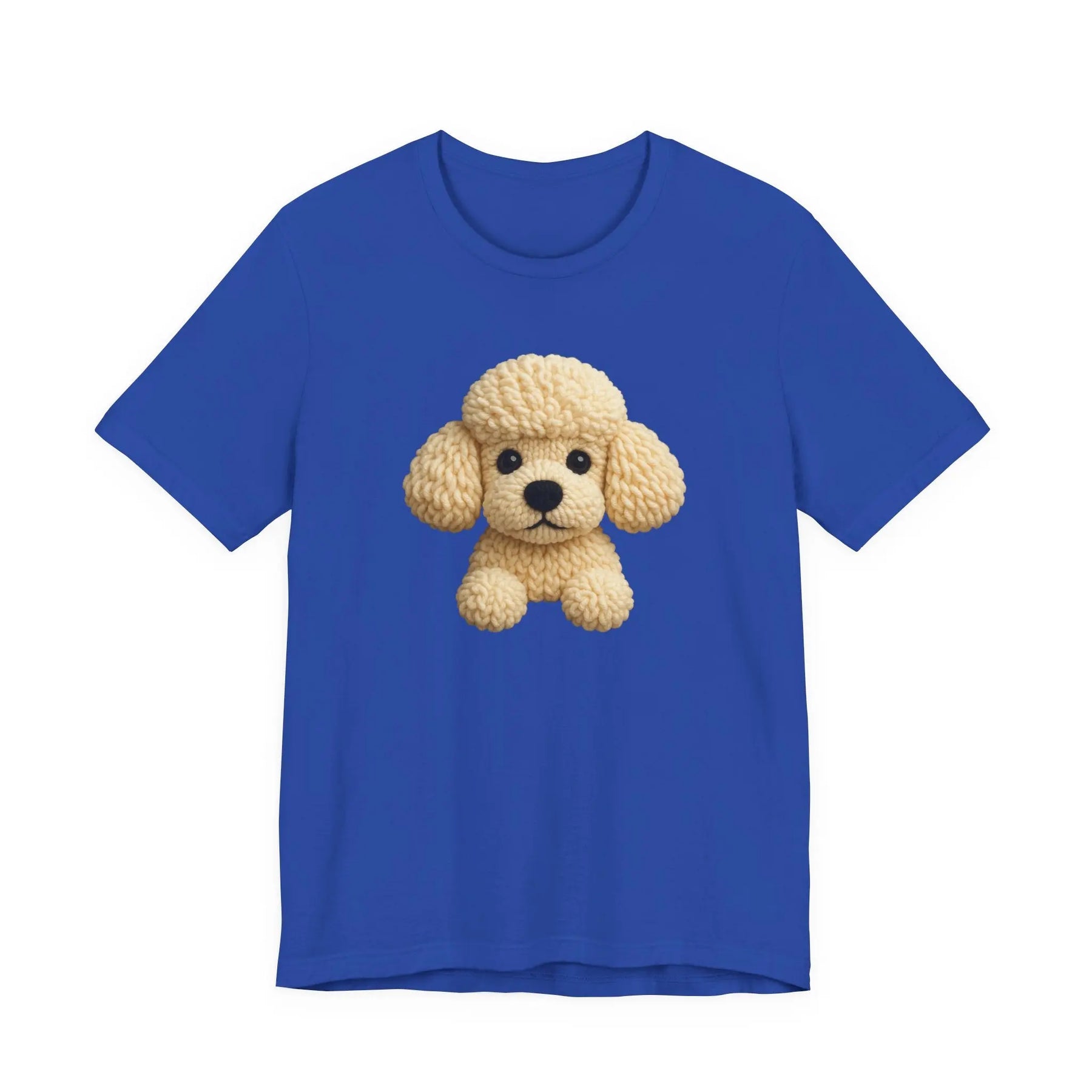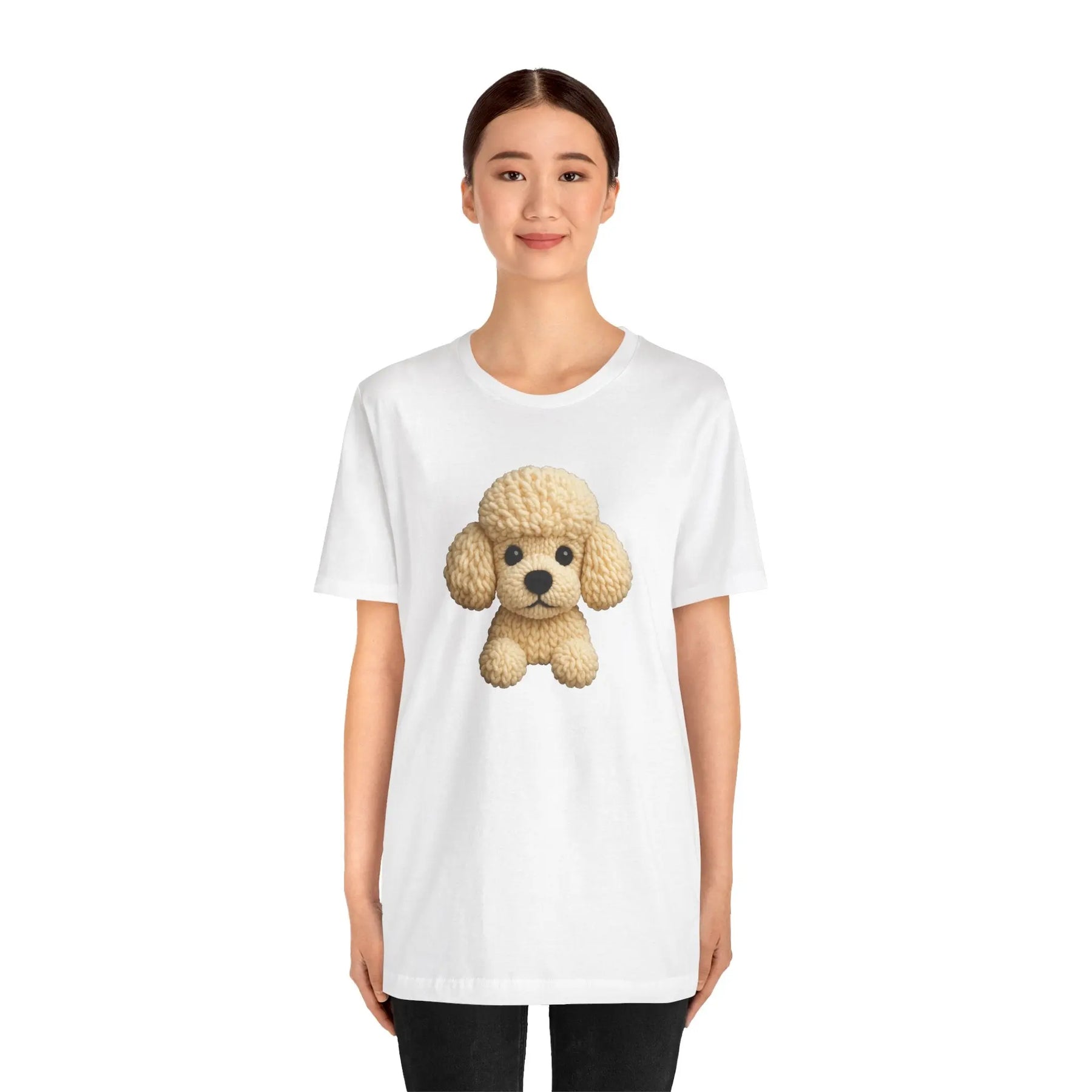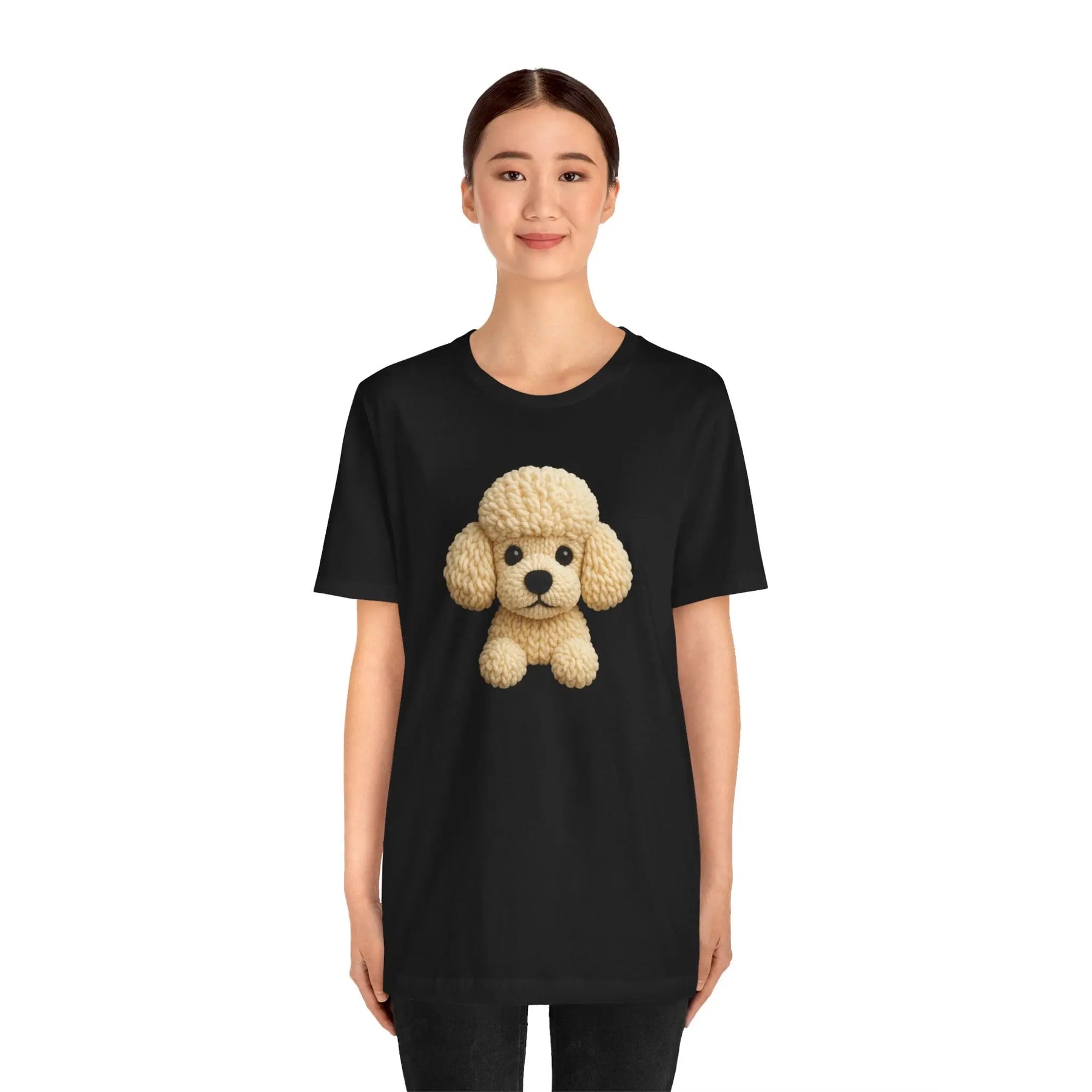 Le coton premium offre une texture douce et respirante. Les coutures latérales, la bande d’épaule et le col côtelé garantissent une excellente tenue au fil du temps. L'impression DTF/DTG préserve les détails du tricot et l’expression du Caniche, pour un rendu précis et durable.