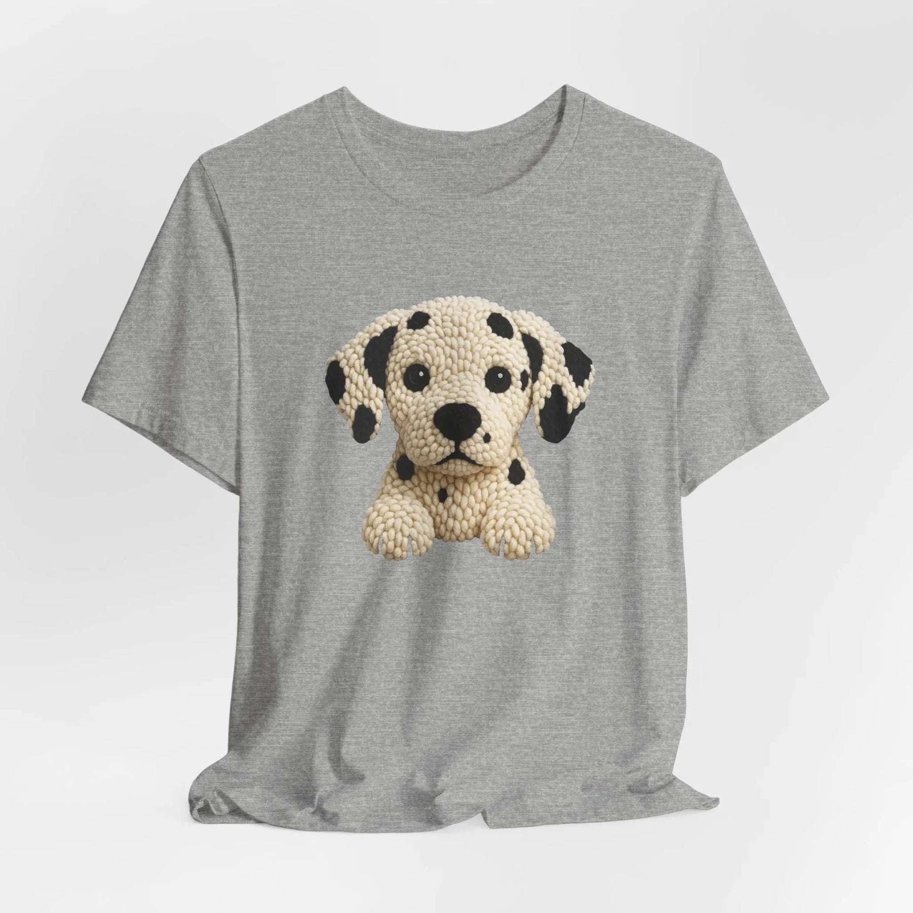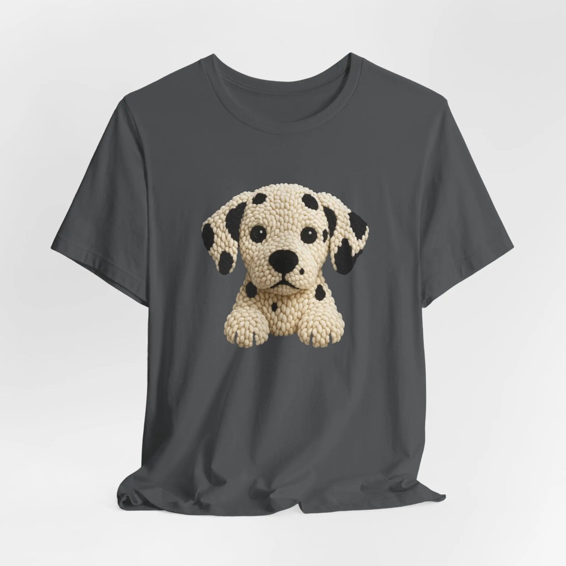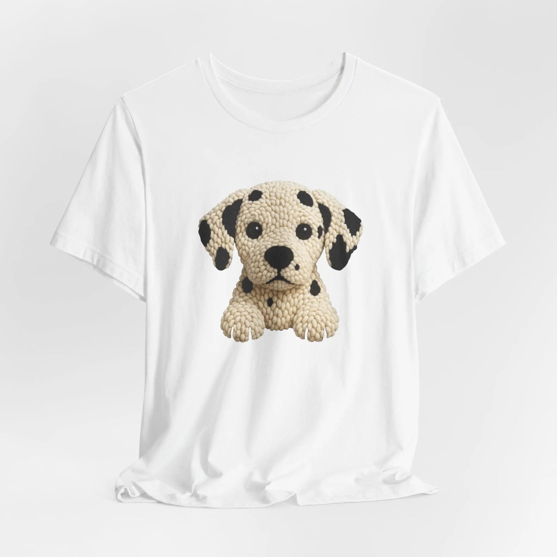 Ce tee-shirt en jersey léger met en avant un adorable dalmatien façon crochet, placé au centre comme un petit trésor à emporter partout. L’illustration, avec son effet laine texturé, rappelle un jouet fait main : tendre, nostalgique et immédiatement réconfortant. C’est le genre de motif qui attire les regards et adoucit la journée, sans jamais en faire trop.