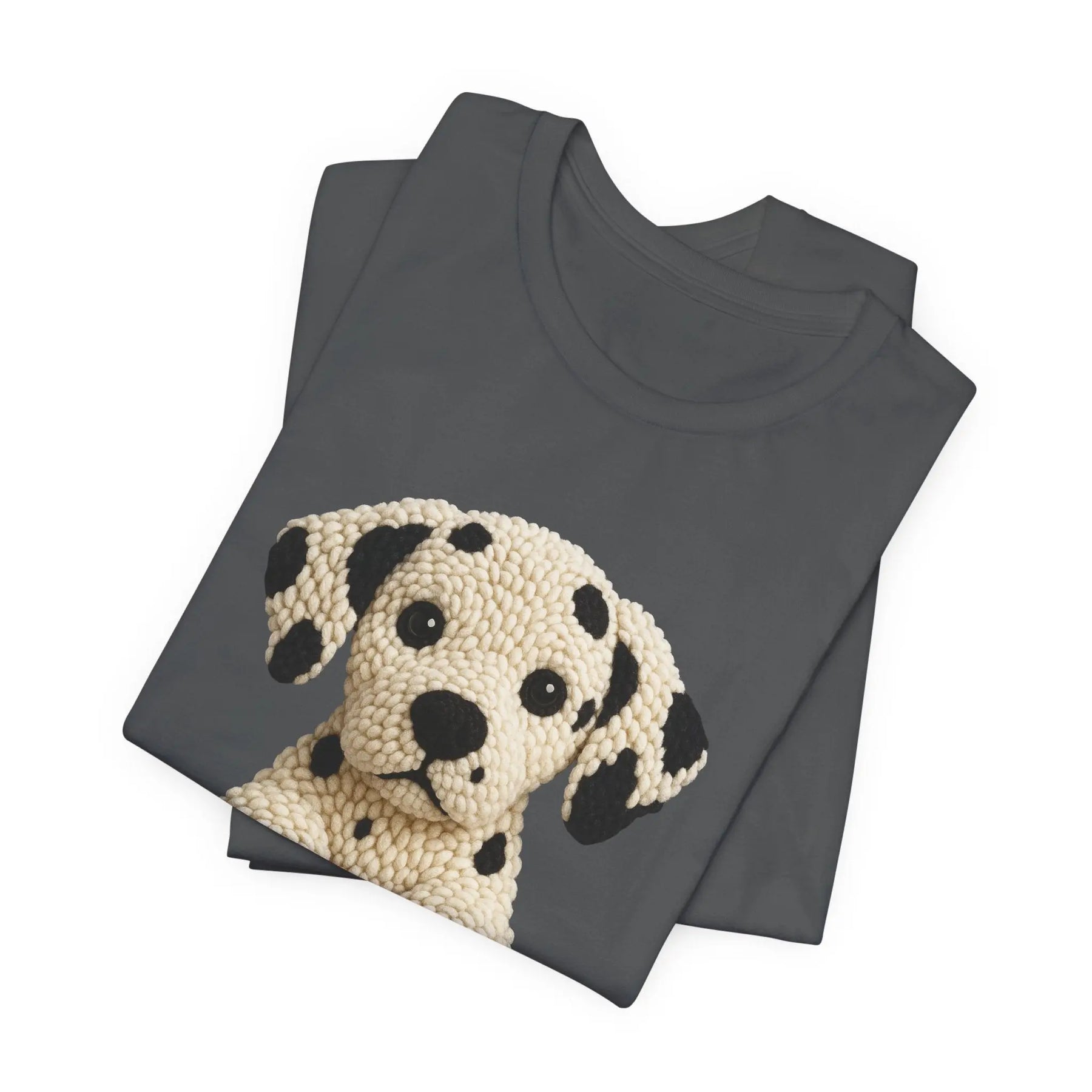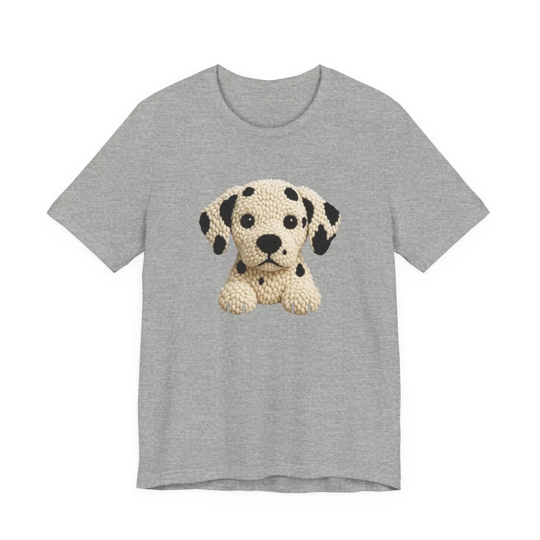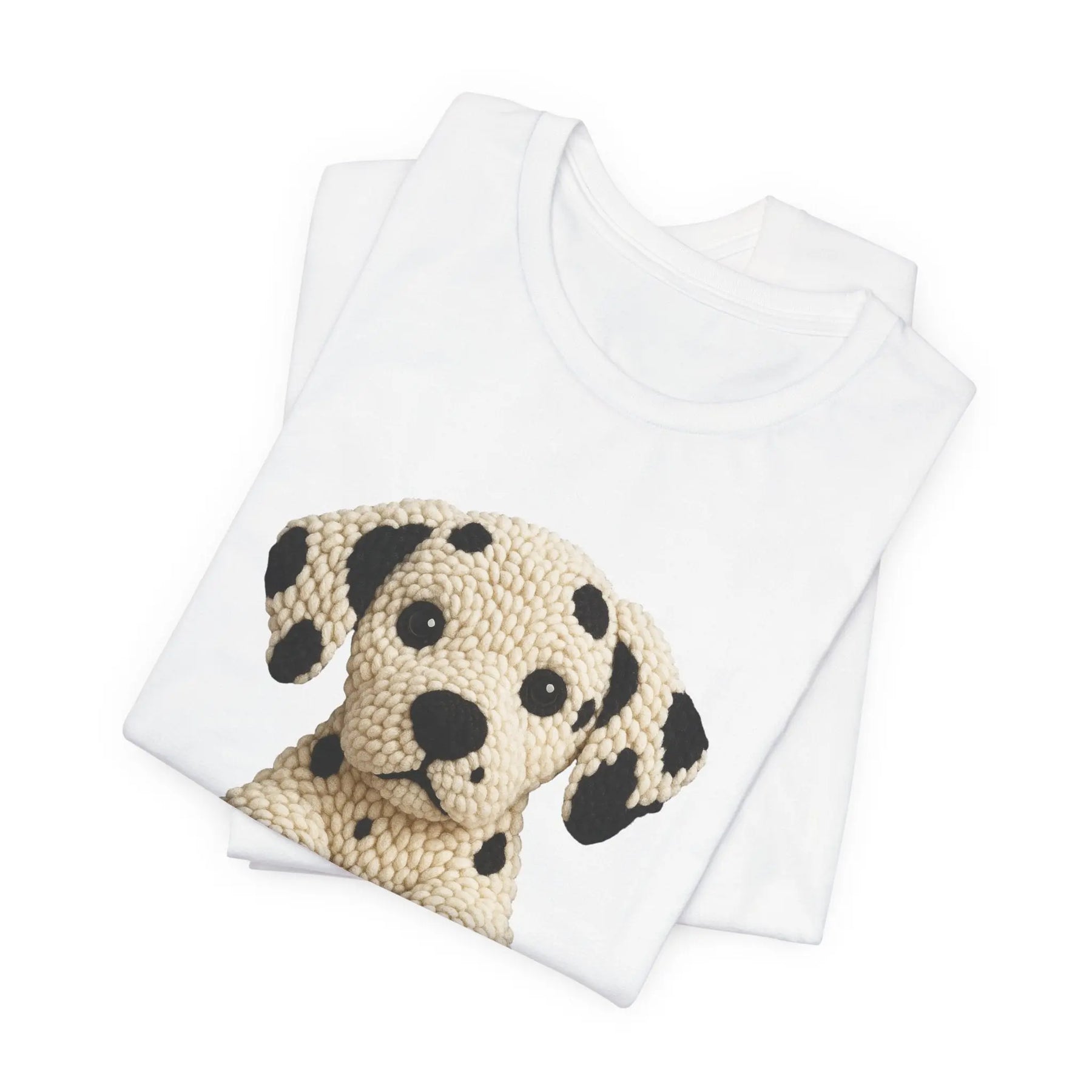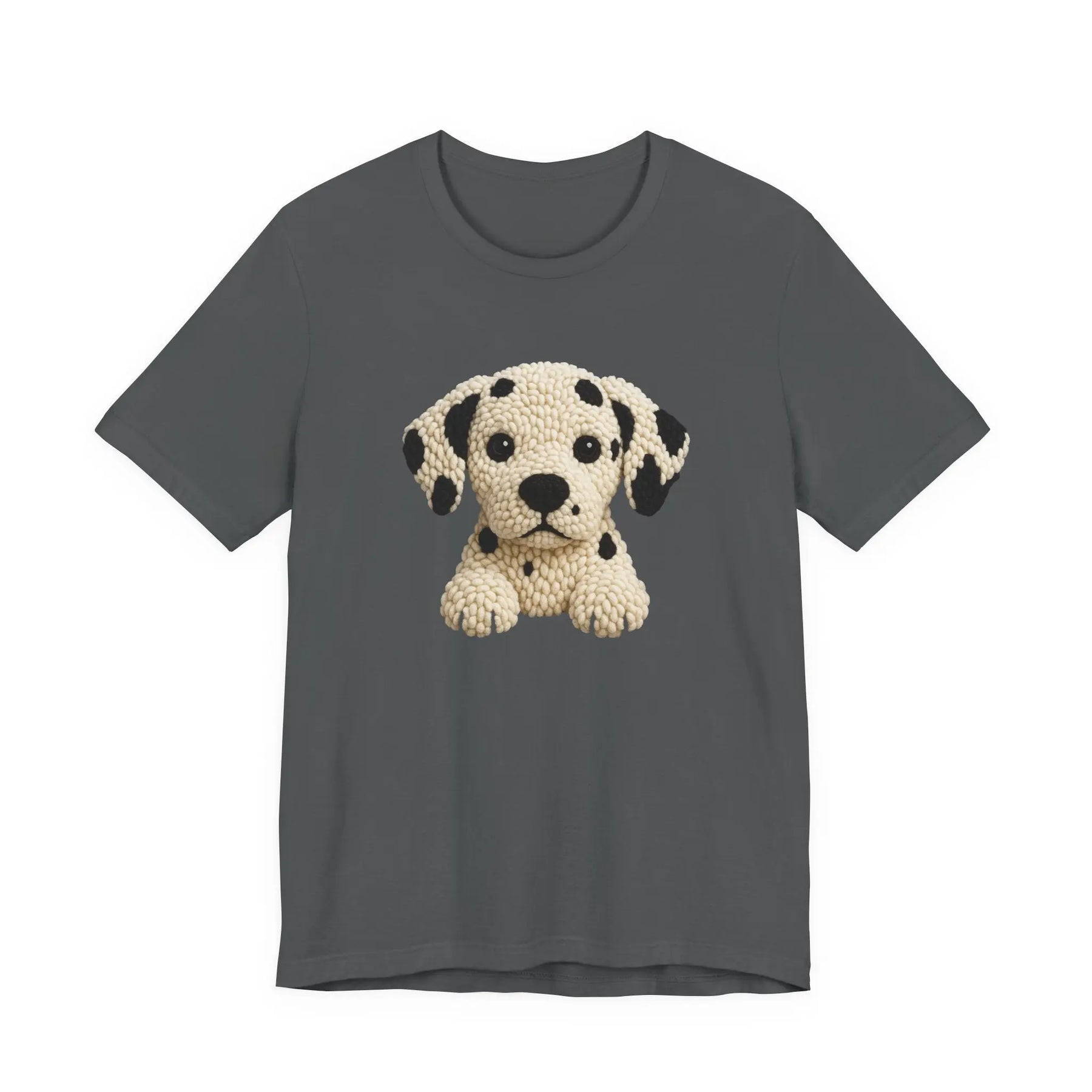 Ce tee-shirt en jersey léger met en avant un adorable dalmatien façon crochet, placé au centre comme un petit trésor à emporter partout. L’illustration, avec son effet laine texturé, rappelle un jouet fait main : tendre, nostalgique et immédiatement réconfortant. C’est le genre de motif qui attire les regards et adoucit la journée, sans jamais en faire trop.