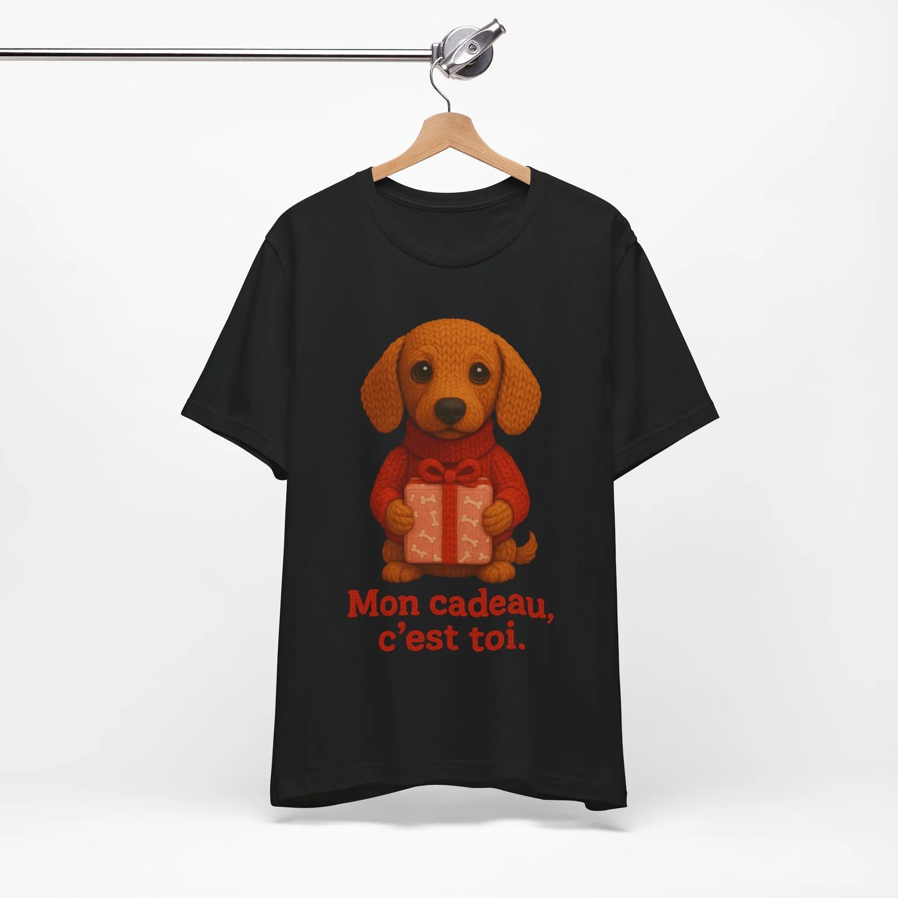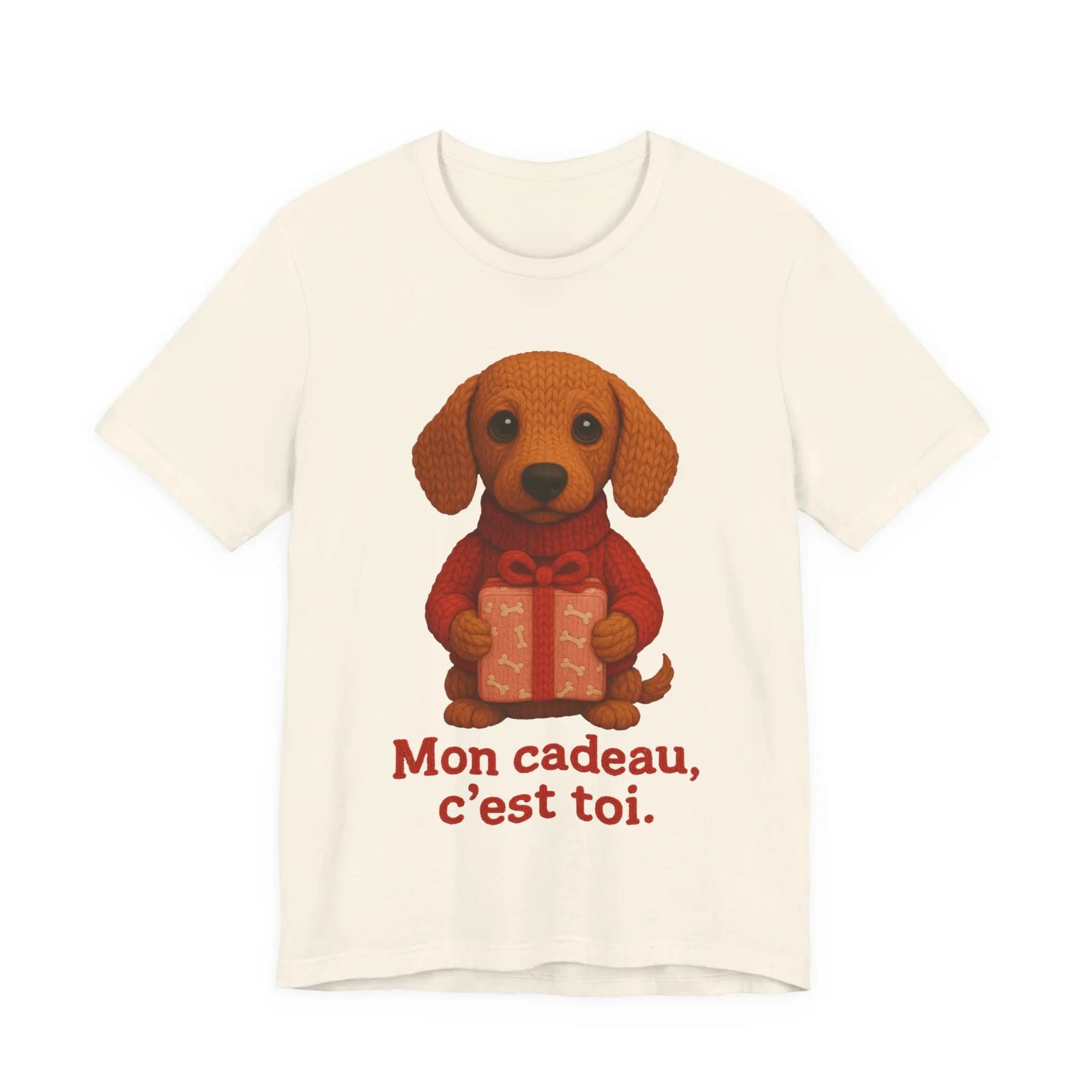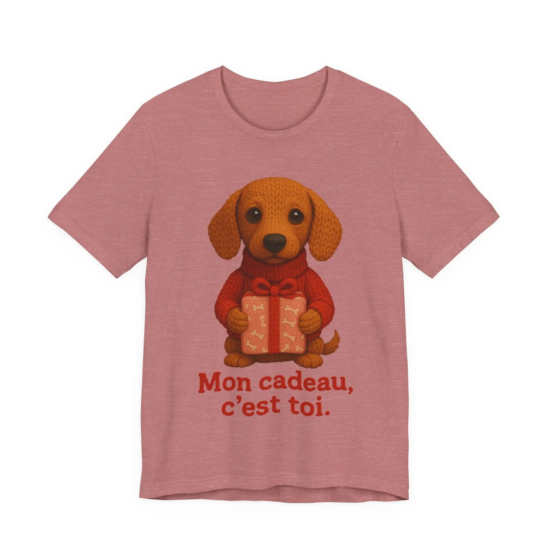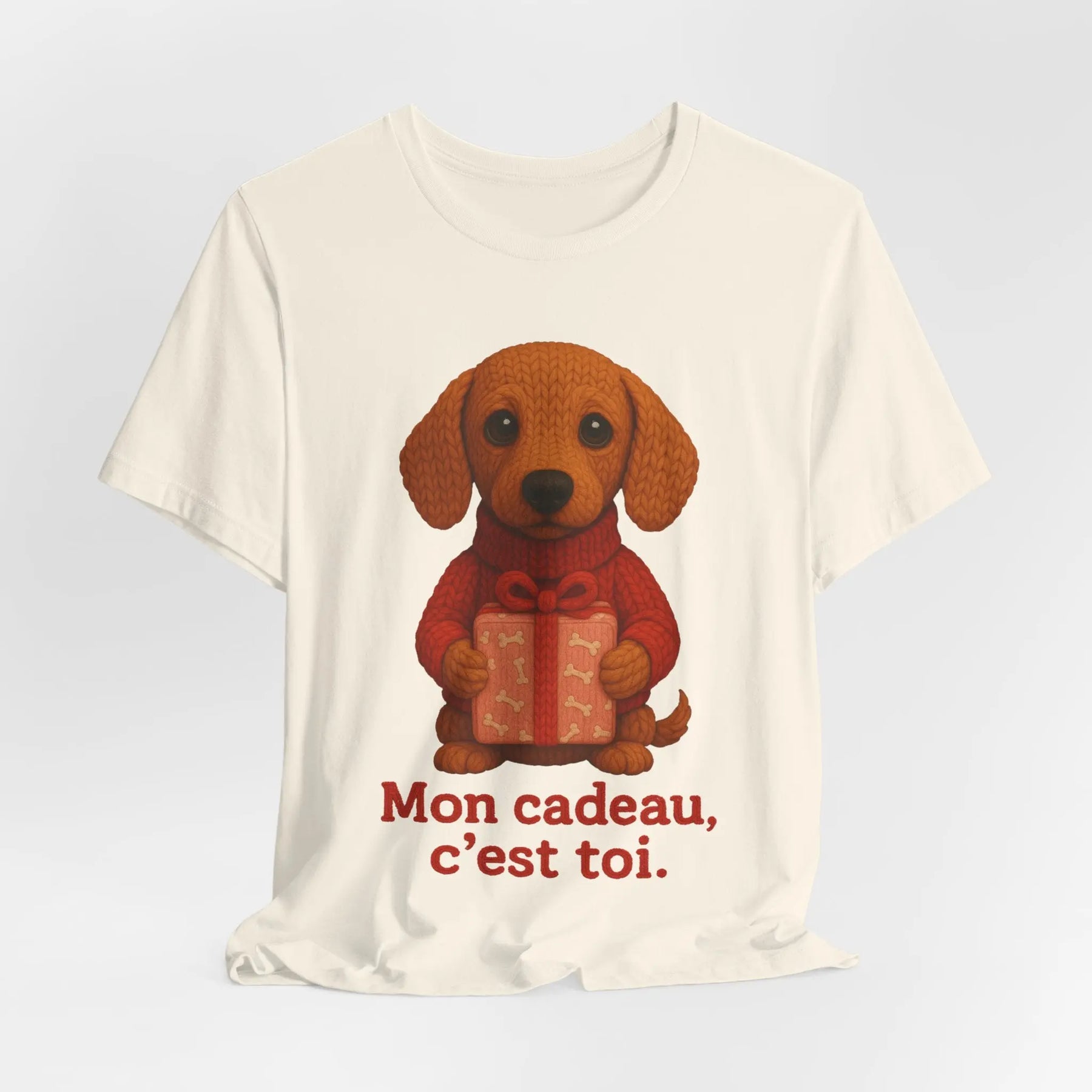 T-shirt en coton premium tout doux, parfait pour traverser l’hiver en gardant confort et élégance. Au centre, un teckel en style gros crochet, tendre et expressif, tenant un cadeau rose décoré de petits os. Une scène simple et réconfortante, qui rappelle les moments chaleureux de décembre, entre un chocolat chaud et les lumières du sapin.