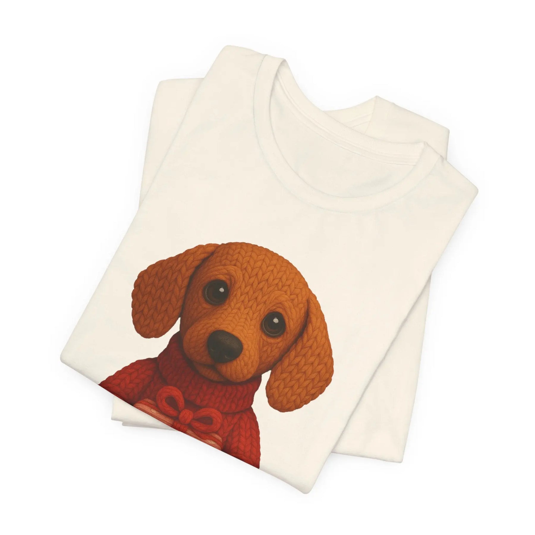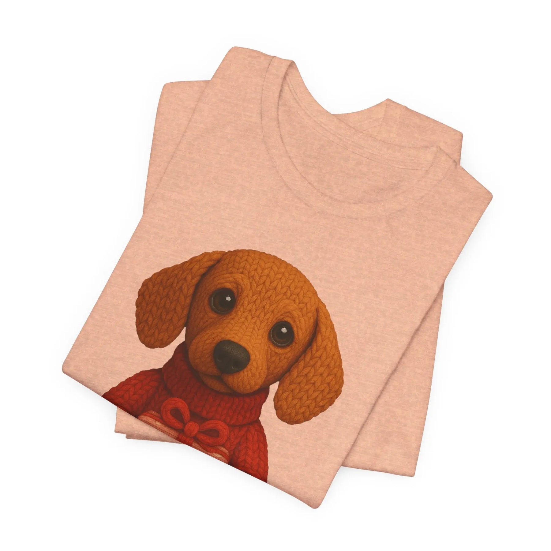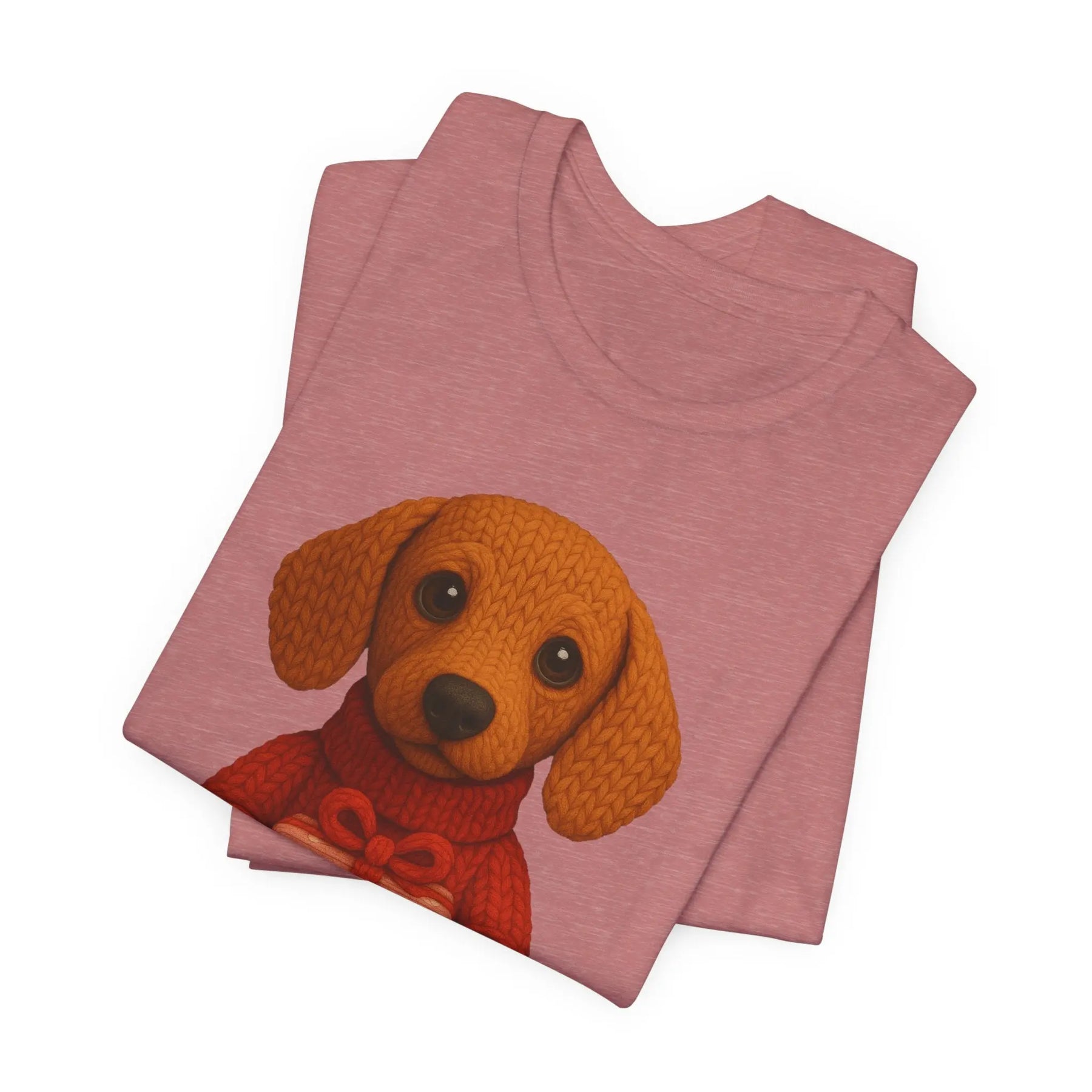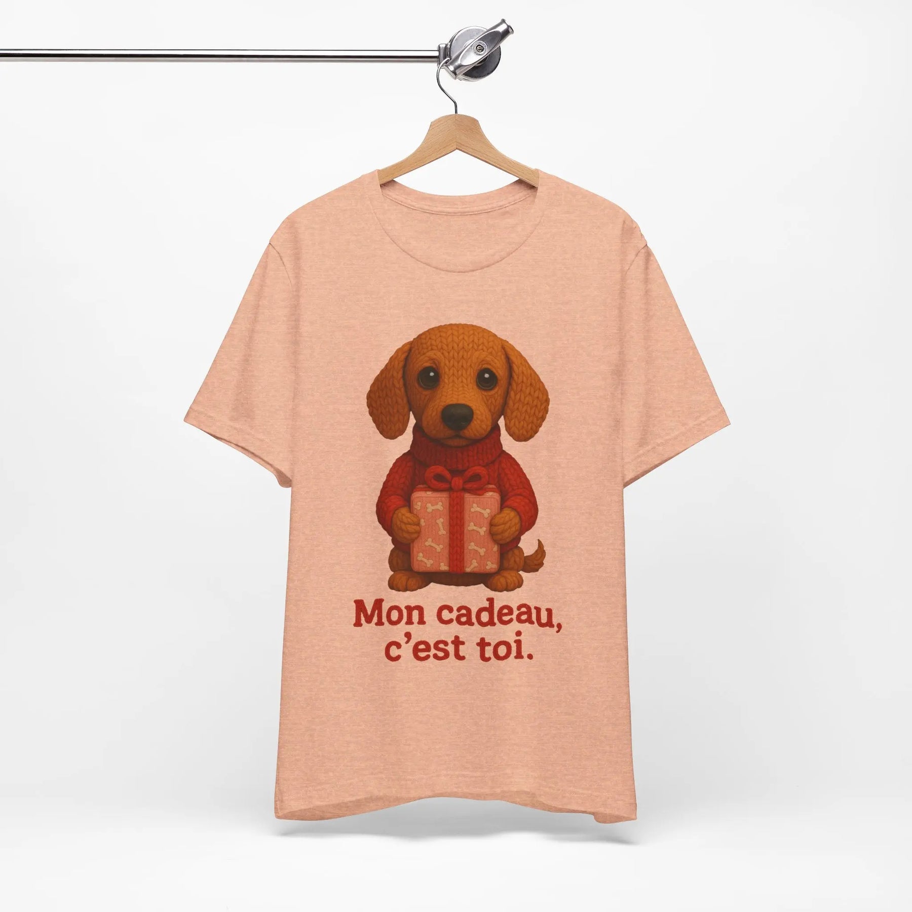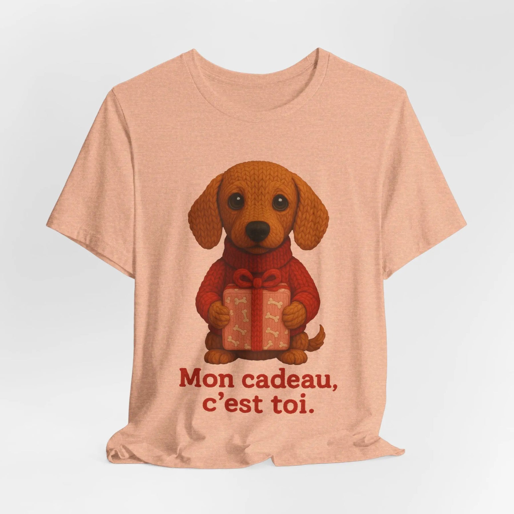 T-shirt en coton premium tout doux, parfait pour traverser l’hiver en gardant confort et élégance. Au centre, un teckel en style gros crochet, tendre et expressif, tenant un cadeau rose décoré de petits os. Une scène simple et réconfortante, qui rappelle les moments chaleureux de décembre, entre un chocolat chaud et les lumières du sapin.