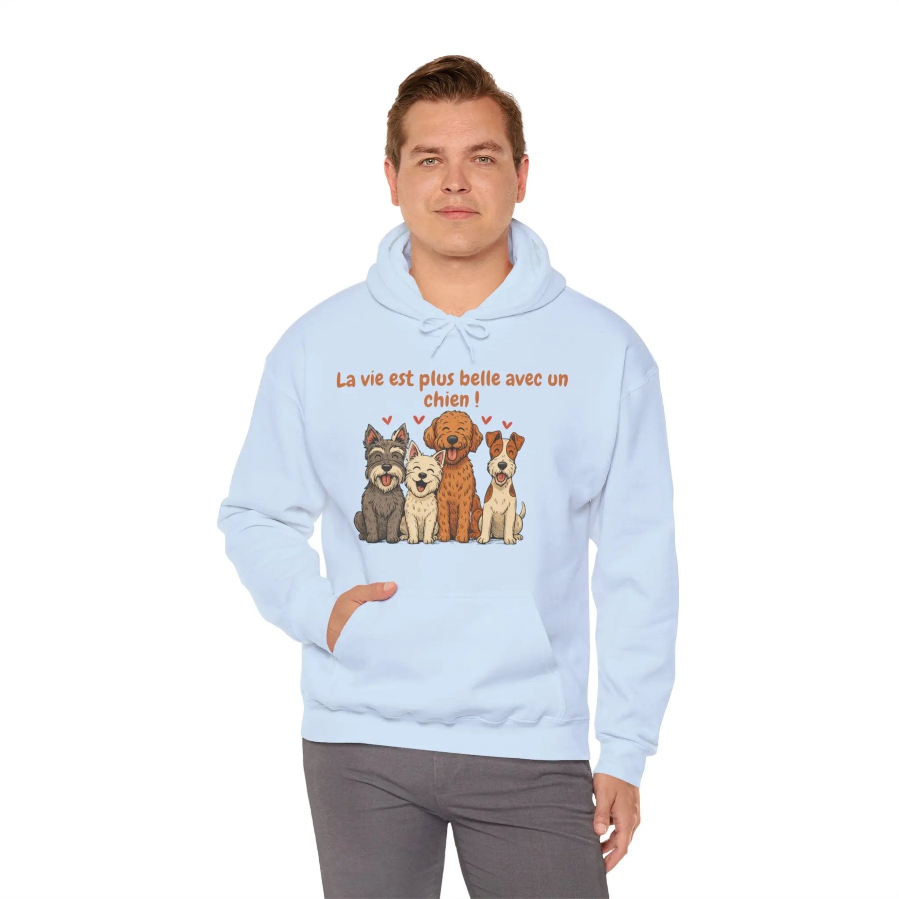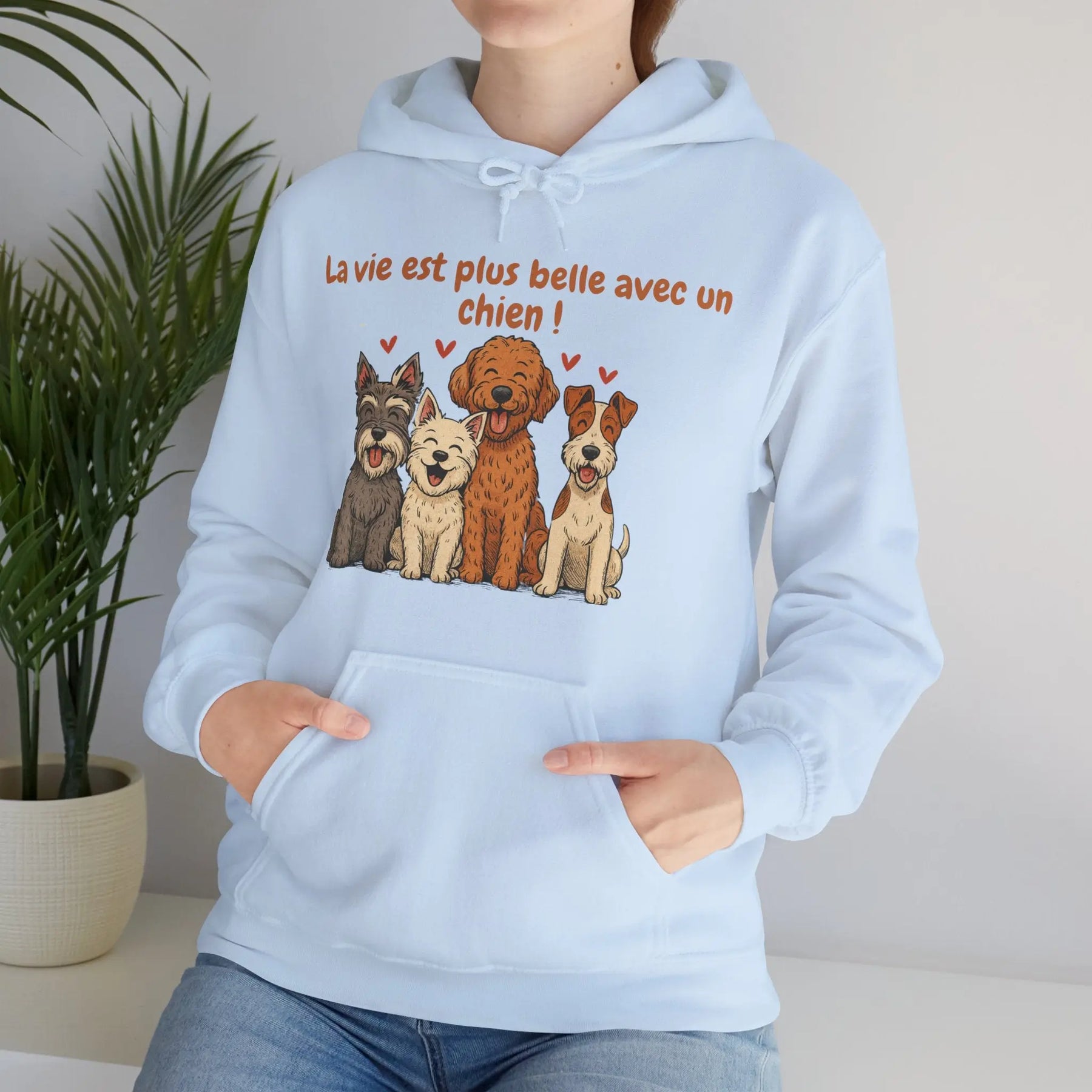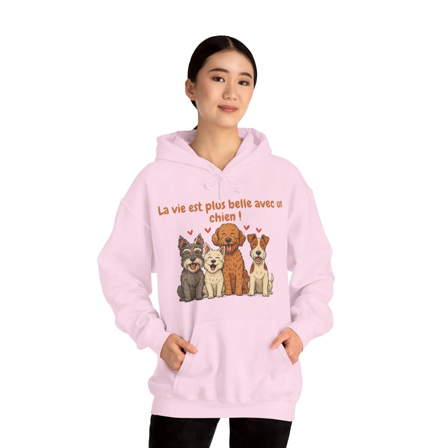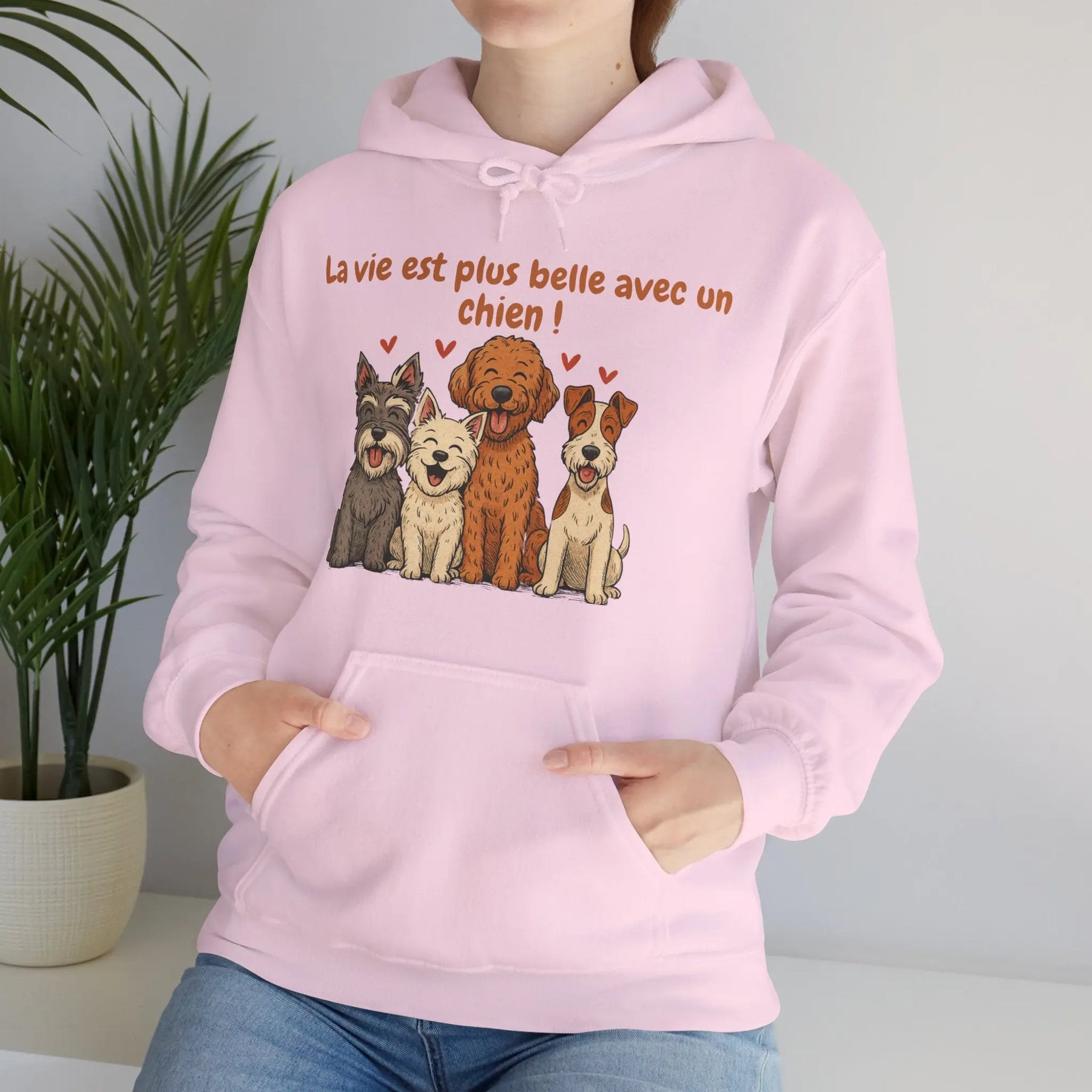 Un sweat-shirt doux, chaleureux et pensé pour les amoureux des chiens. Avec ses illustrations de quatre races pleines de personnalité (schnauzer, westie, labradoodle et fox terrier) et son message tendre « La vie est plus belle avec un chien », ce modèle apporte une touche de réconfort au quotidien.