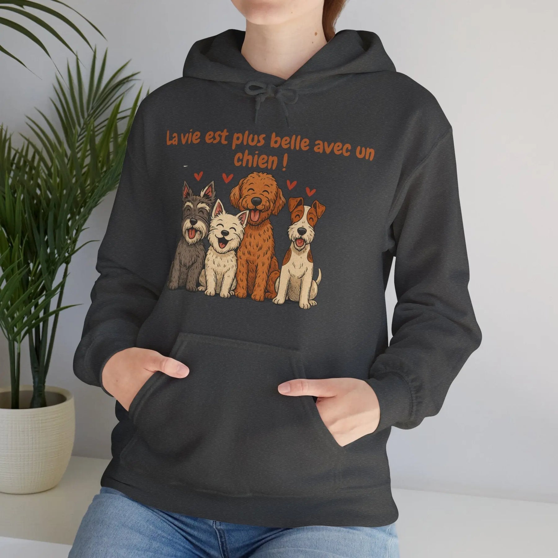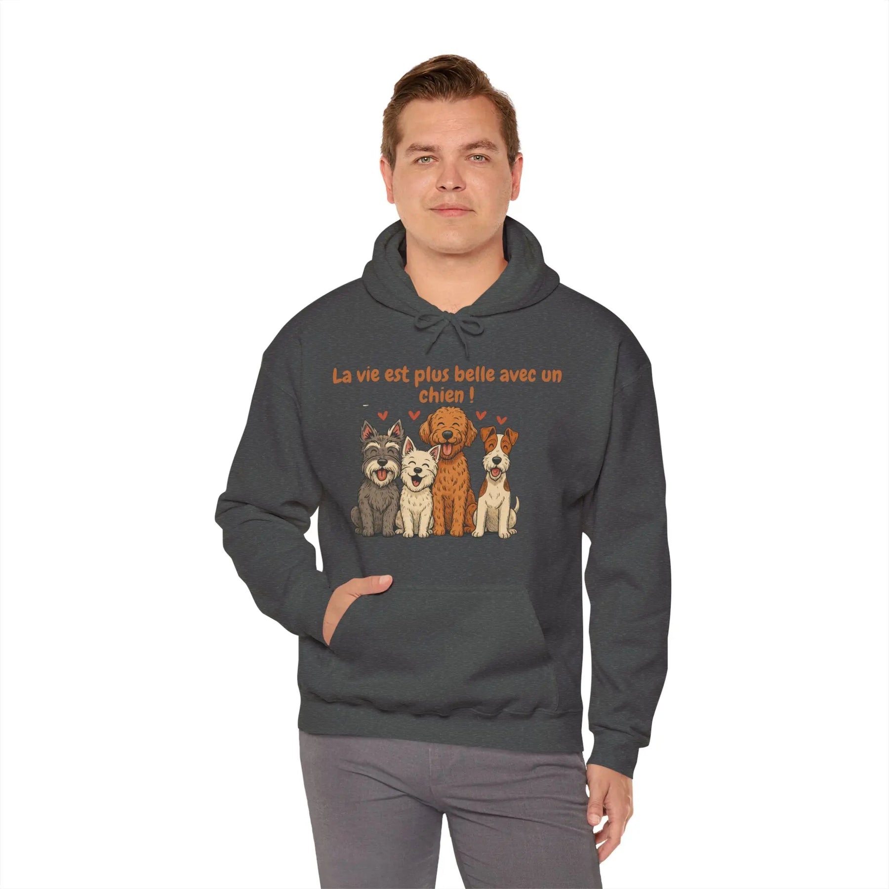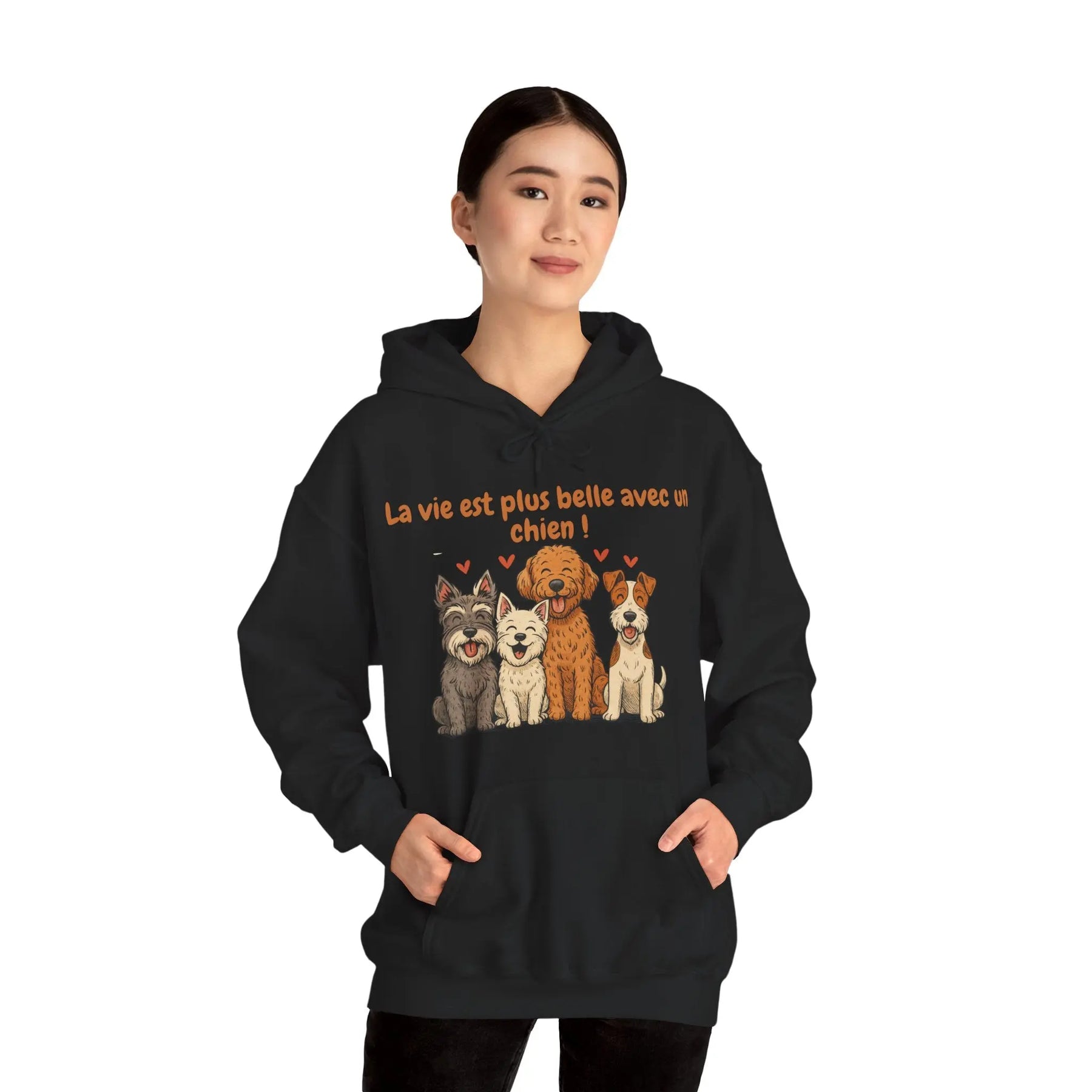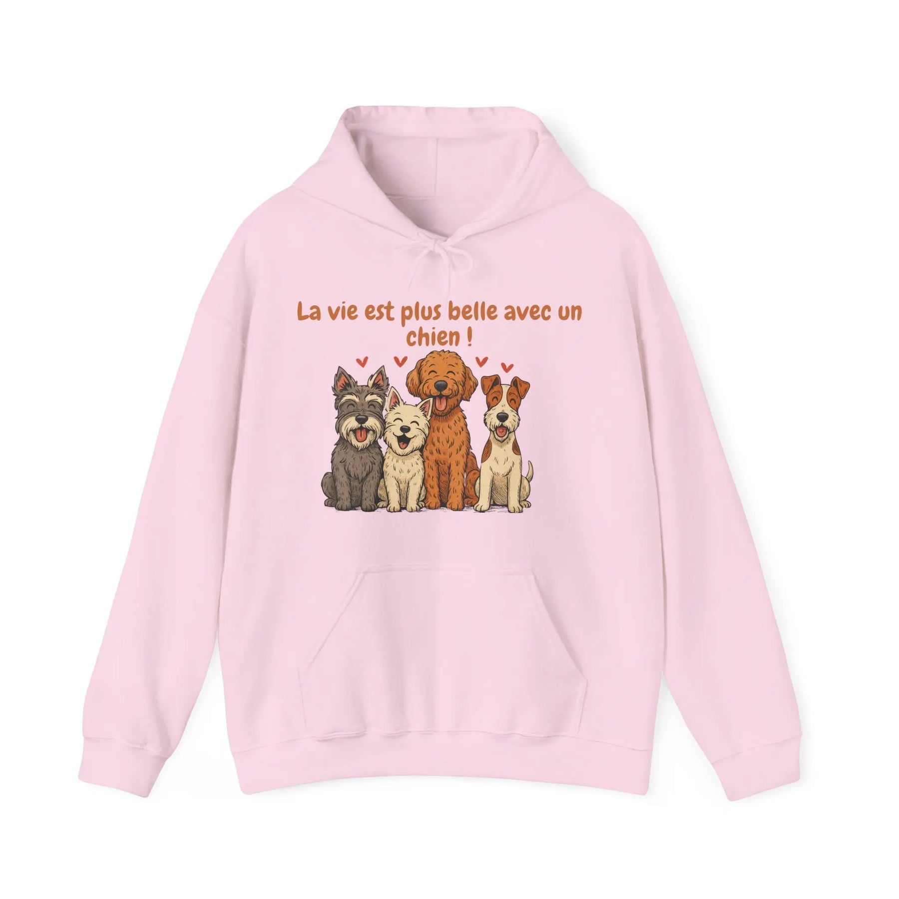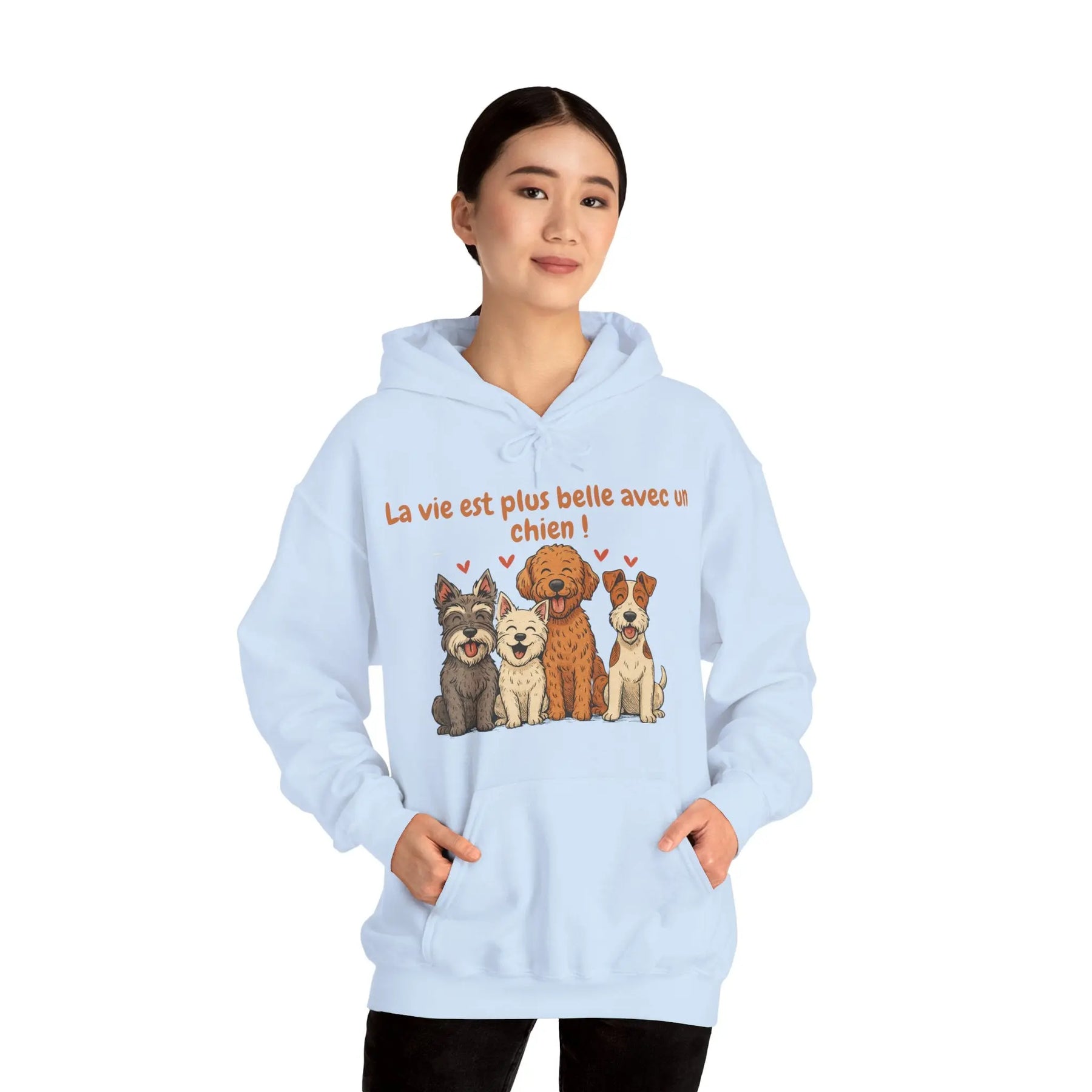 Un sweat-shirt doux, chaleureux et pensé pour les amoureux des chiens. Avec ses illustrations de quatre races pleines de personnalité (schnauzer, westie, labradoodle et fox terrier) et son message tendre « La vie est plus belle avec un chien », ce modèle apporte une touche de réconfort au quotidien.