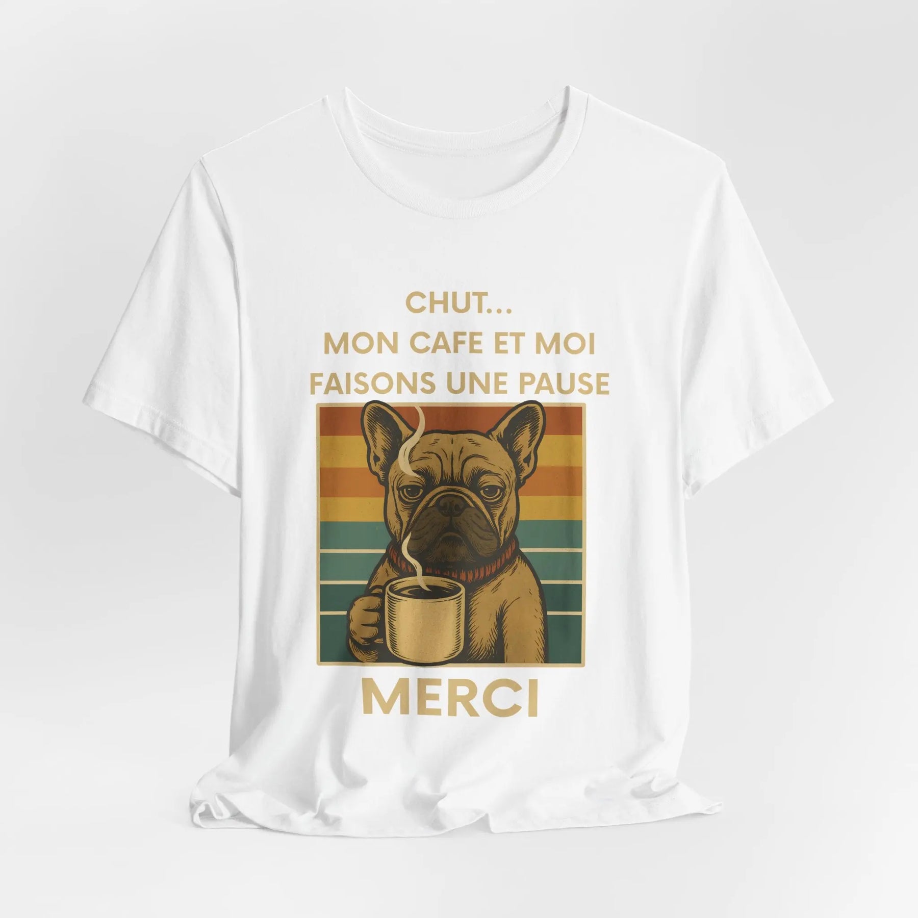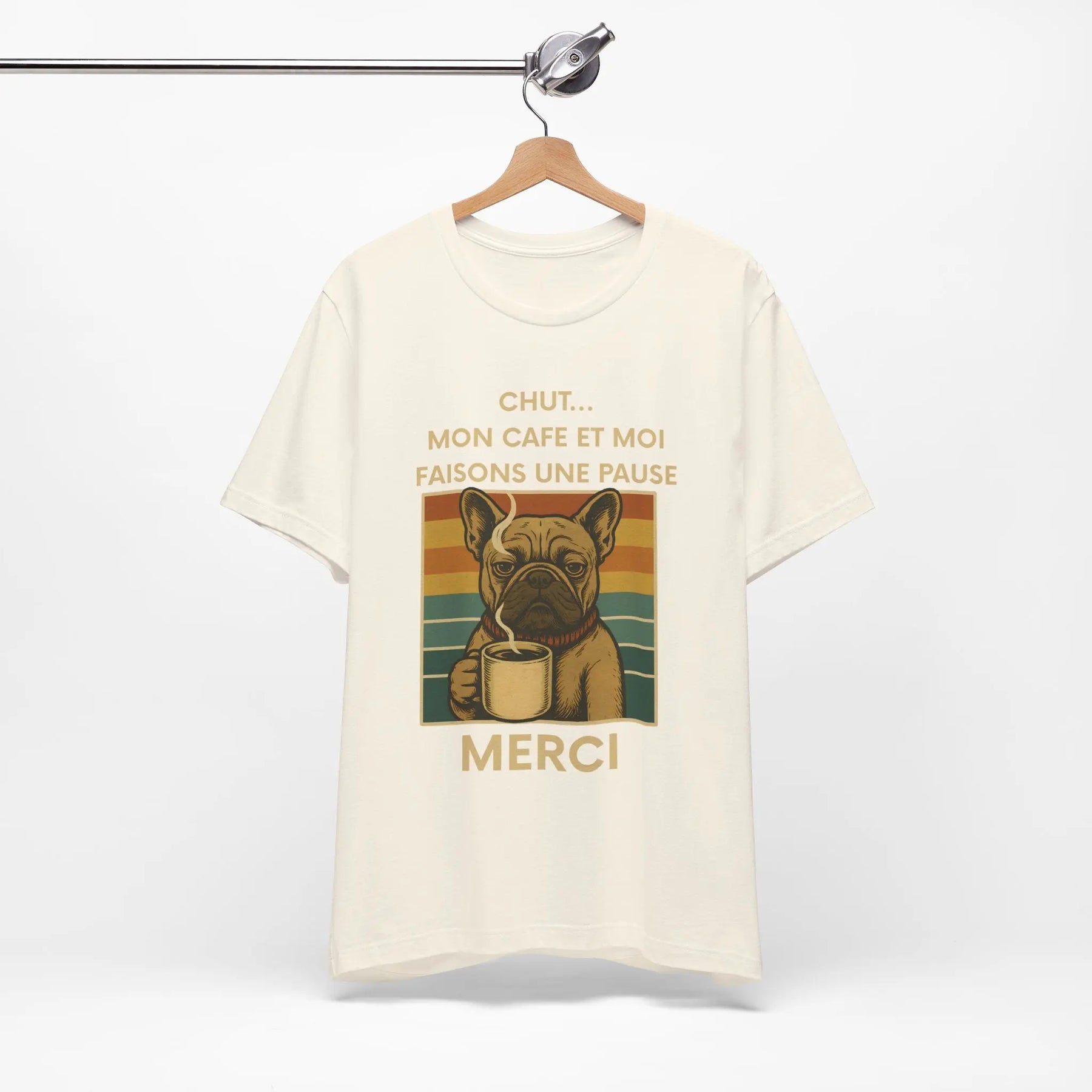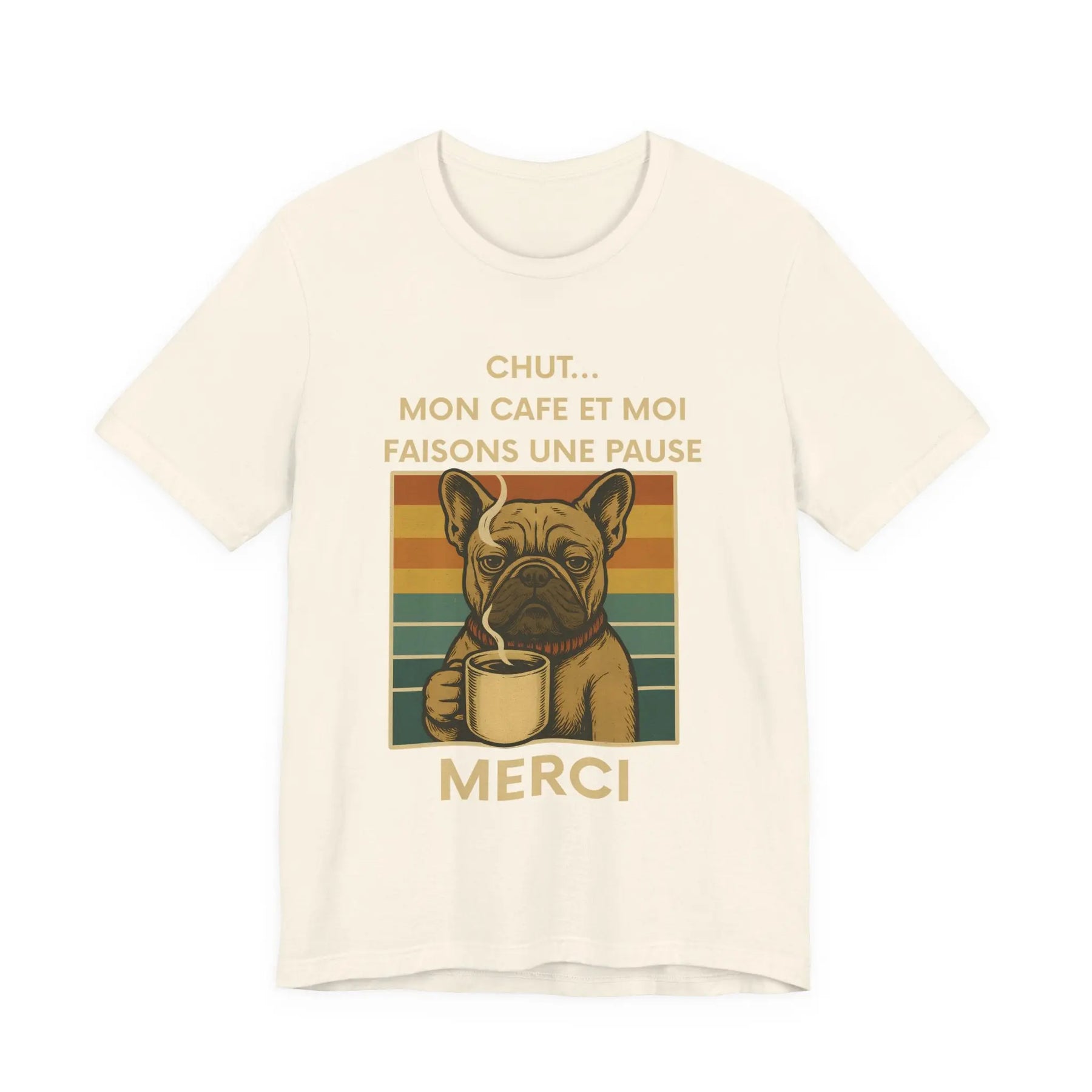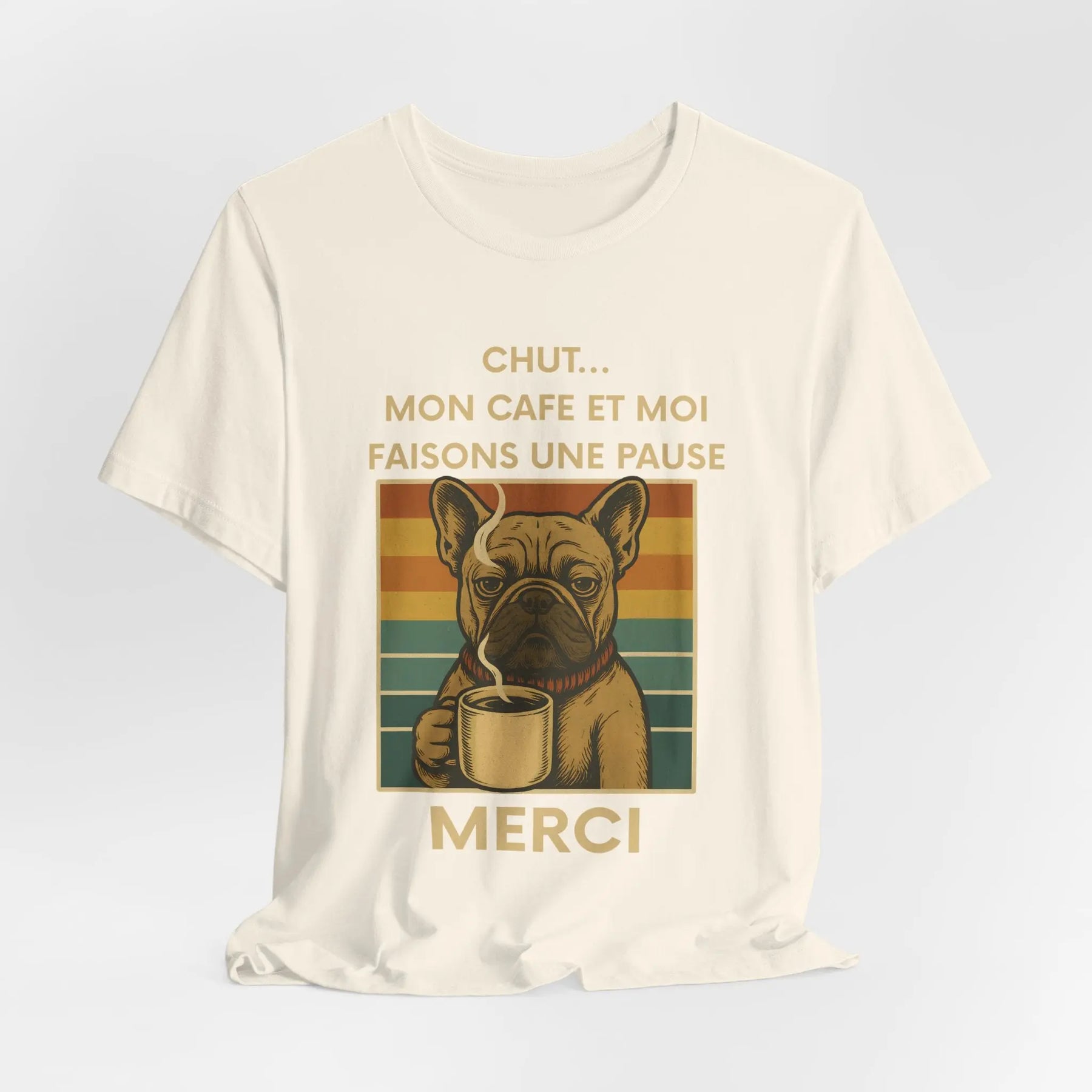 Un tee-shirt doux, léger et terriblement attachant, qui capture ce petit moment sacré du matin : celui où l’on savoure son café en silence. Au centre, un bouledogue au regard expressif, illustré dans un style vintage rétro, tenant sa tasse fumante avec une attitude délicieusement bougonne. Un design entièrement pensé pour les amoureux de chiens… et de café.