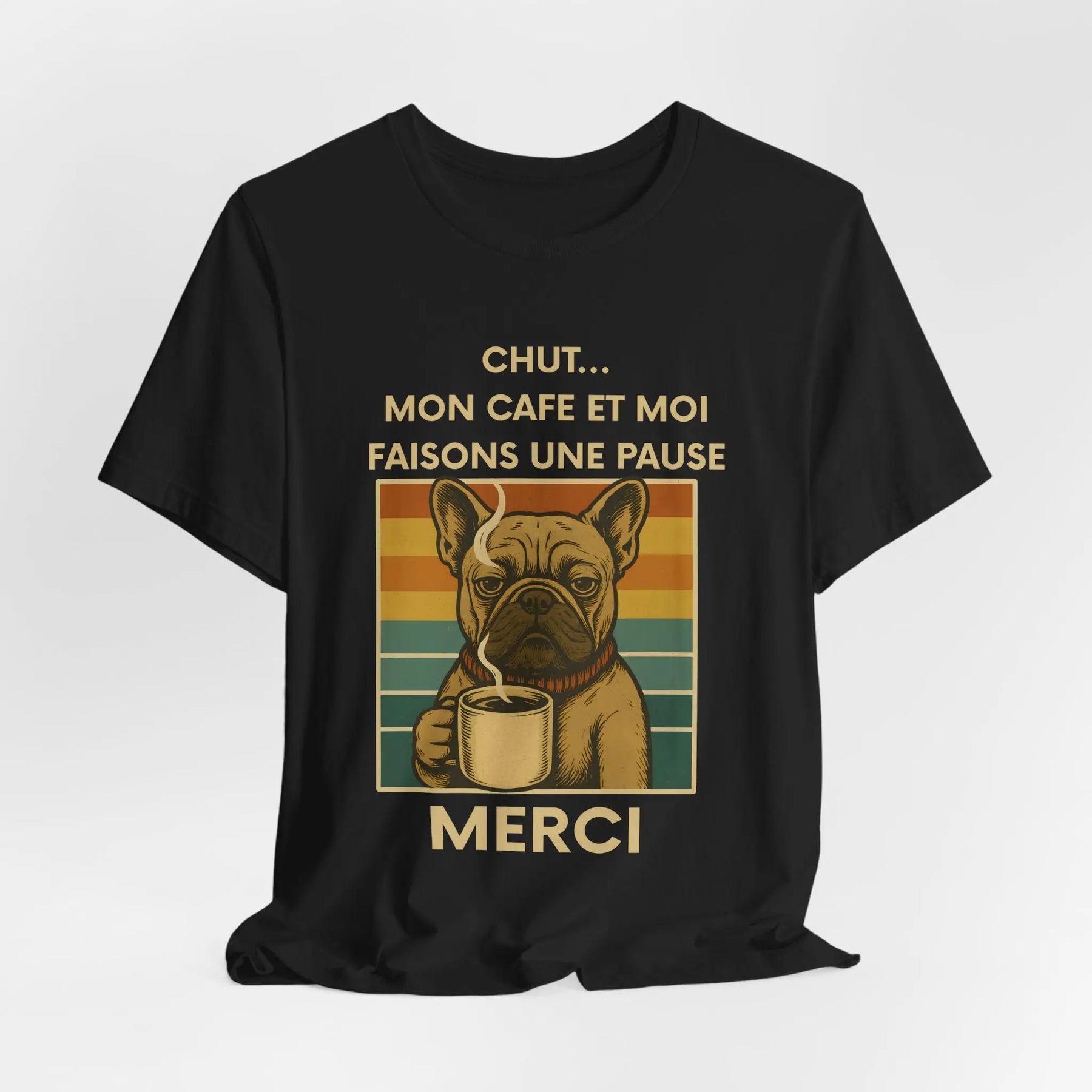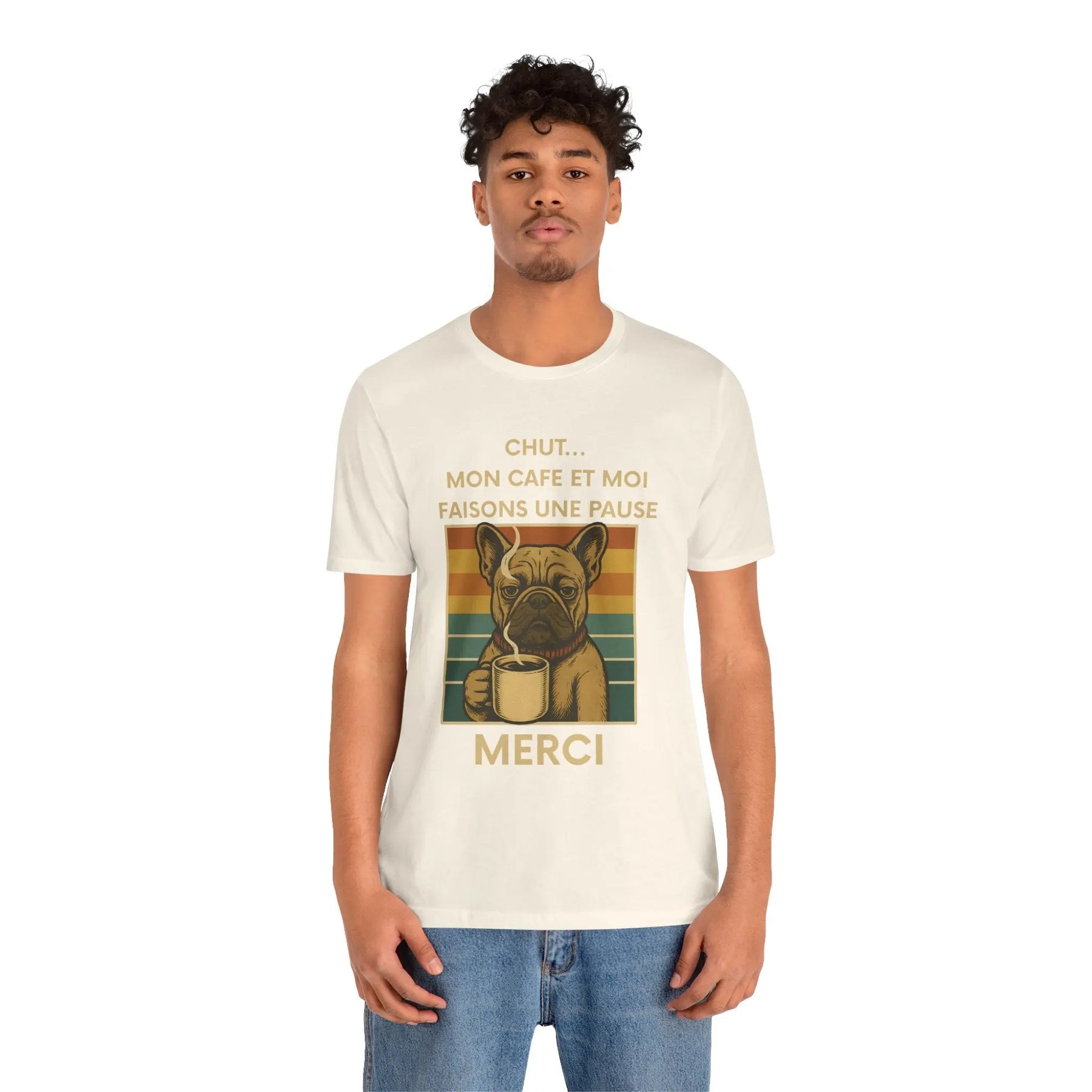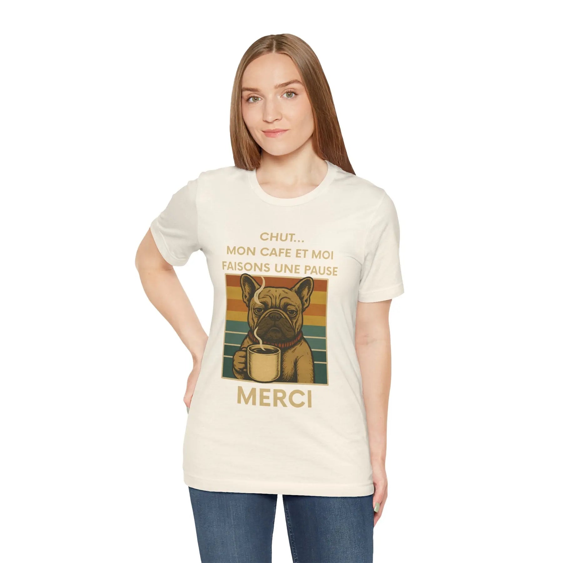 Un tee-shirt doux, léger et terriblement attachant, qui capture ce petit moment sacré du matin : celui où l’on savoure son café en silence. Au centre, un bouledogue au regard expressif, illustré dans un style vintage rétro, tenant sa tasse fumante avec une attitude délicieusement bougonne. Un design entièrement pensé pour les amoureux de chiens… et de café.